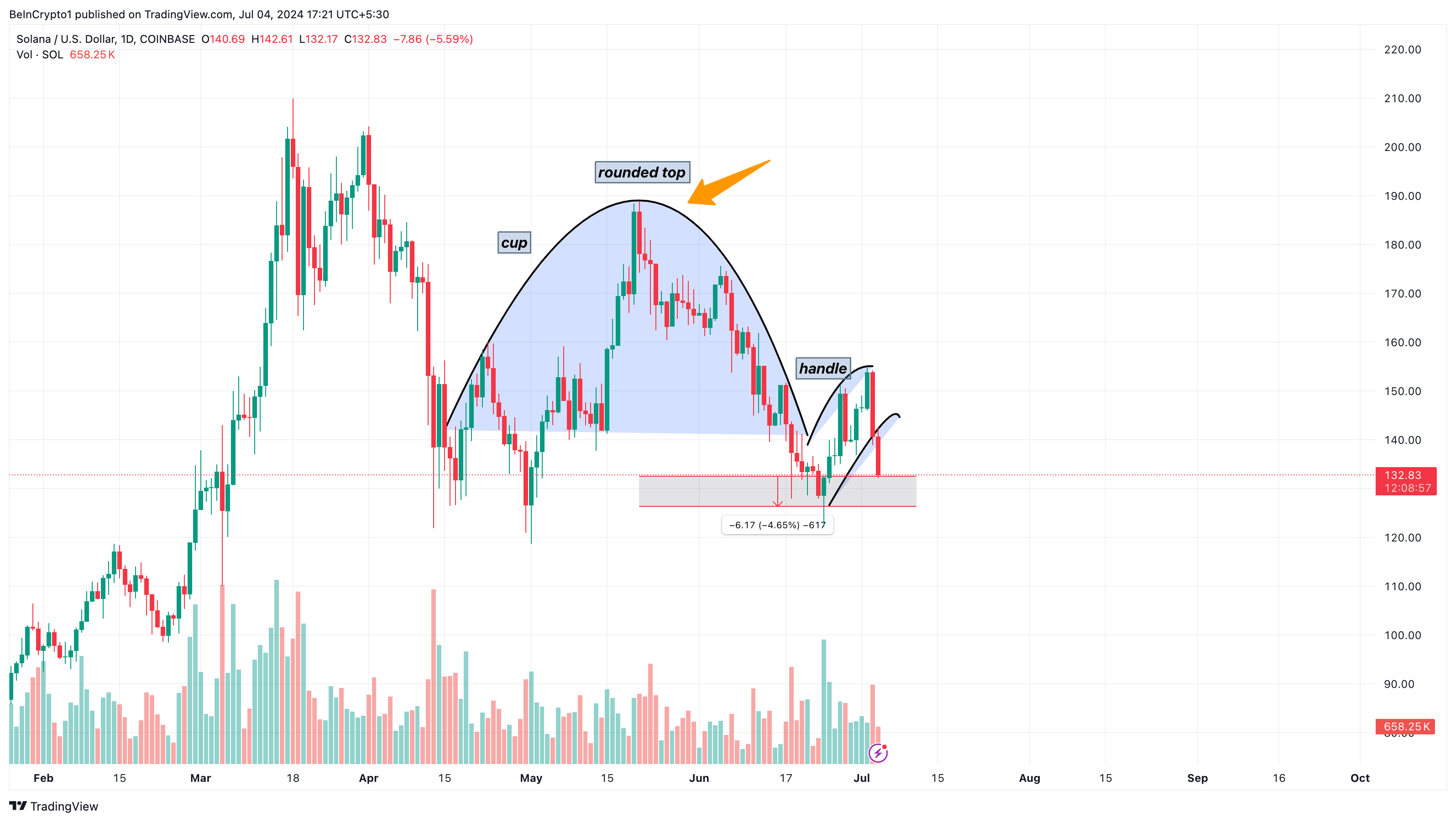 علاوة على ذلك، في نفس الرسم البياني، لاحظنا أن SOL شكلت قمة دائرية مقترنة بكأس ومقبض مقلوب. يظهر نمط القمة الدائرية عندما يصل السعر إلى نقطة عالية ويتجه الآن نحو الاتجاه الهابط.