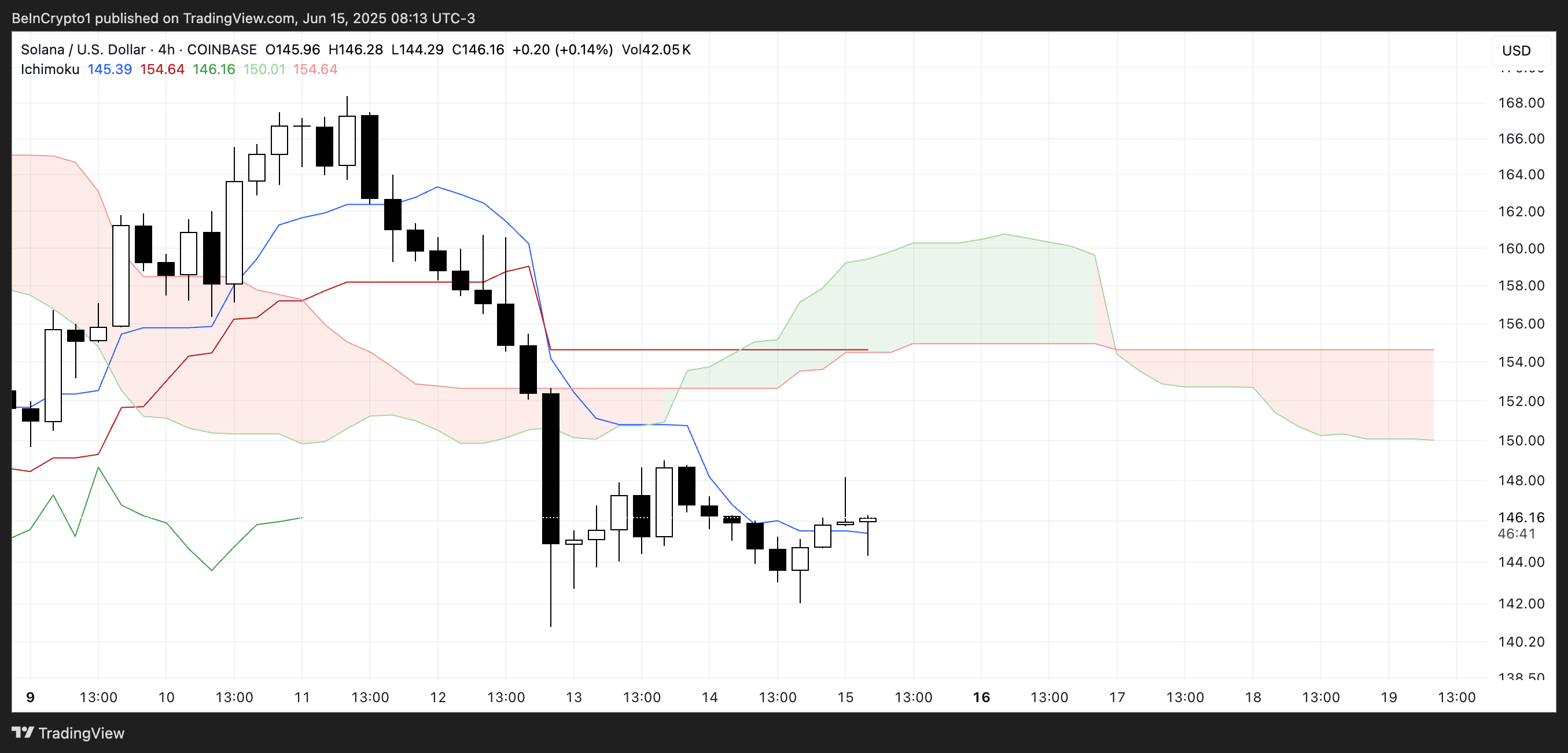 يظهر مخطط سحابة إيشيموكو لسولانا إعدادًا هبوطيًا مستمرًا. تظل حركة السعر تحت الكومو (السحابة)، التي انتقلت من الأحمر إلى الأخضر في المستقبل القريب ولكنها لا تزال تشير إلى مقاومة فوقية.
