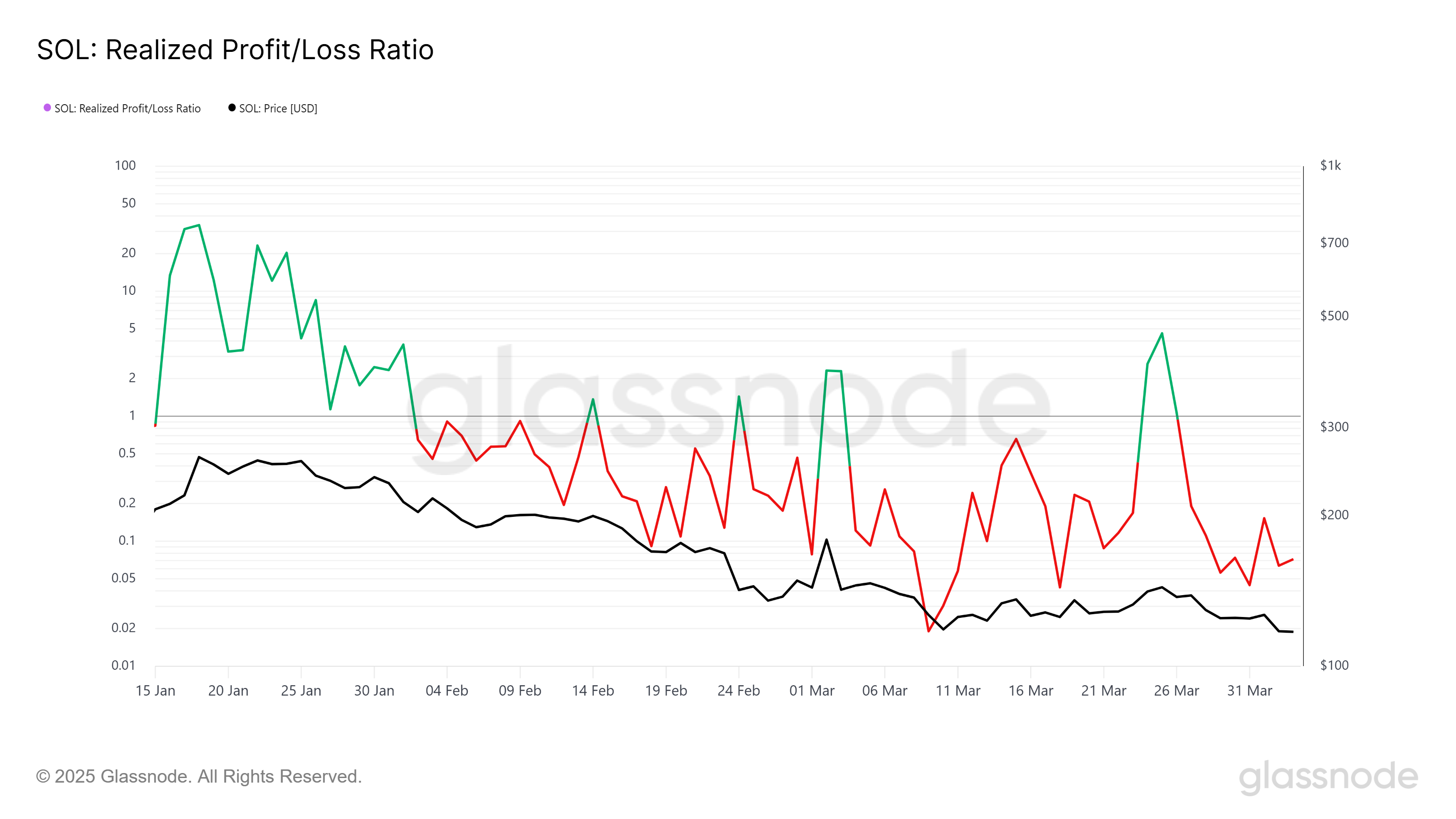 يظهر مؤشر الربح/الخسارة المحقق (RPL) أن سولانا كانت تعاني من أداء ضعيف لمعظم فبراير ومارس. بينما كانت هناك لحظات قصيرة من الربح لحاملي المدى القصير (STHs)، كان الاتجاه العام هبوطيًا.