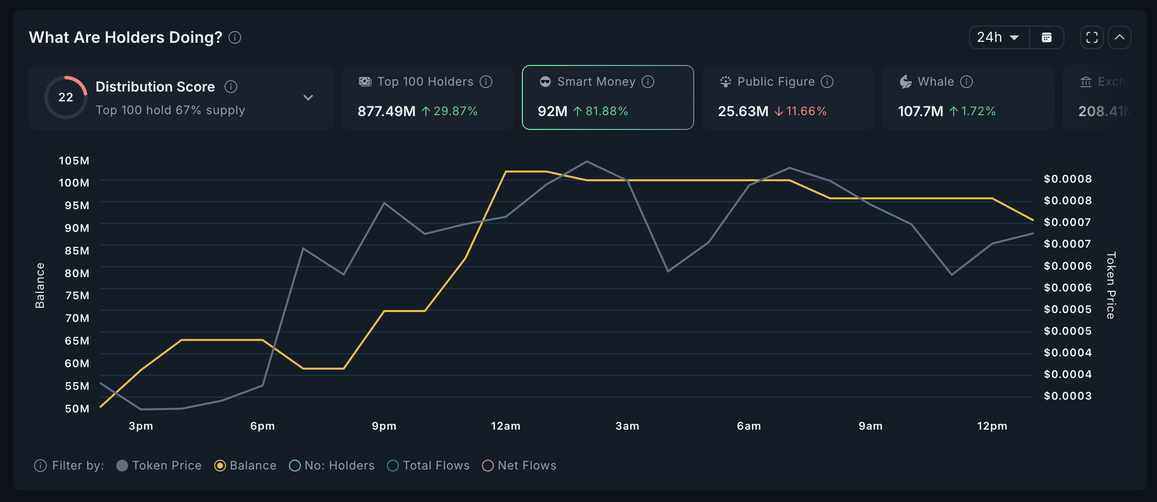 من الجدير بالذكر أن تراكم الأموال الذكية ارتفع بنسبة 126% في نفس الفترة، حيث ارتفع من 10,96 مليون إلى 26,7 مليون رمز. كما زاد عدد أفضل 100 حامل وشخصيات عامة، مما يشير إلى تزايد الثقة بين المشاركين الرئيسيين.