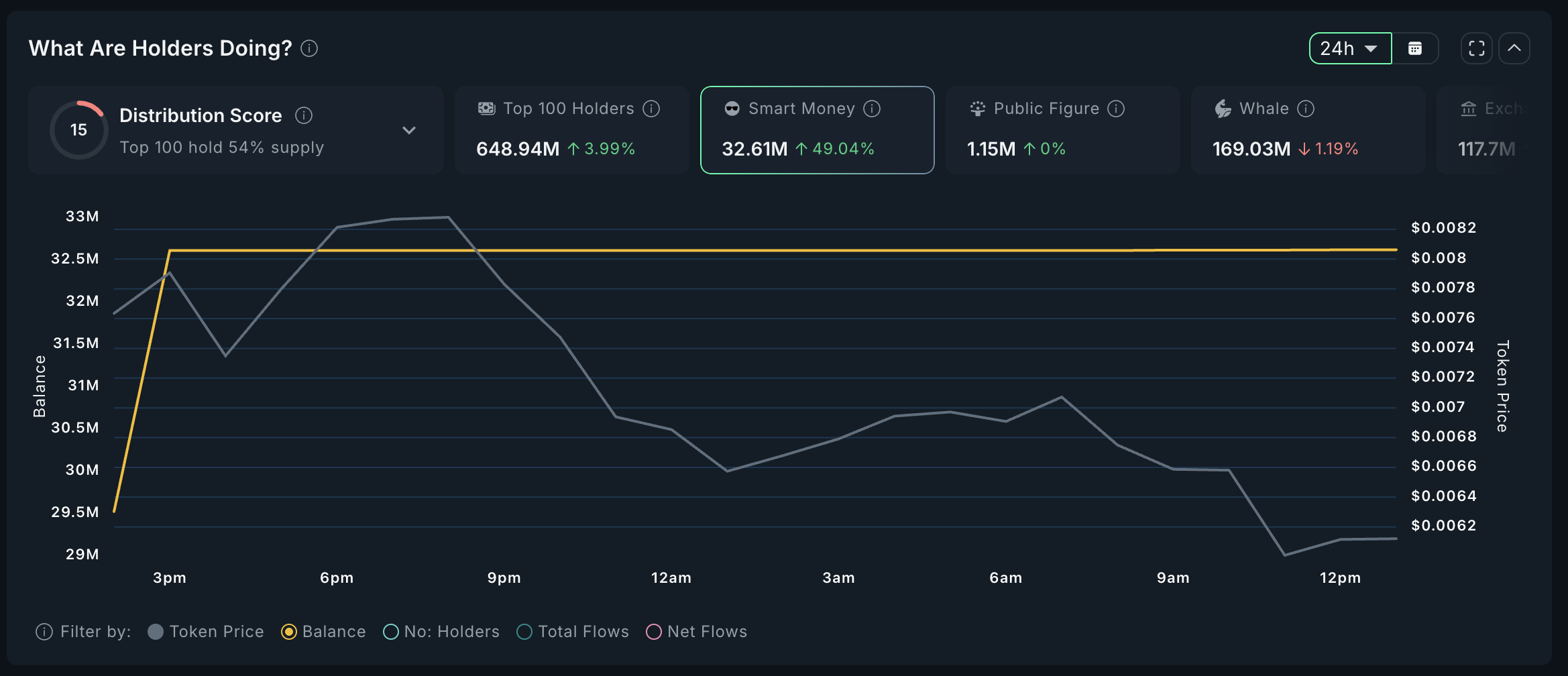 زادت محافظ الأموال الذكية بشكل ملحوظ من حيازاتها، حيث نما العرض بنسبة 49% في آخر 24 ساعة - من 29,5 مليون إلى 32,6 مليون رمز.