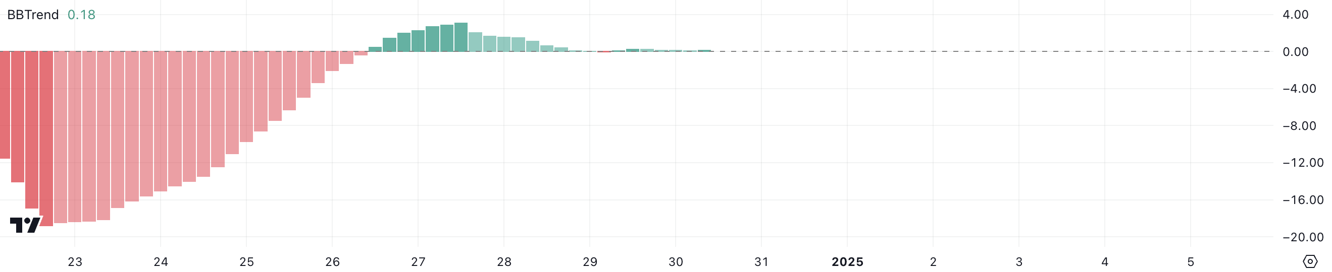 SOL BBTrend حاليًا عند 0,18، مما يشير إلى موقف محايد بعد التعافي من مستويات سلبية عميقة بدأت في 23 ديسمبر.
