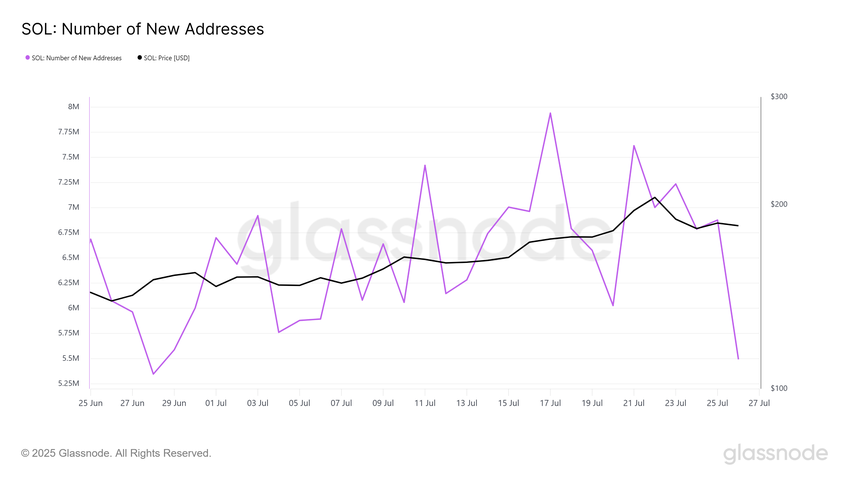 تظهر الزخم الكلي لسولانا أيضًا علامات ضعف. وصل عدد العناوين الجديدة إلى أدنى مستوى شهري، مع انخفاض معدل إنشاء العناوين الجديدة بشكل كبير يوميًا. في الـ48 ساعة الماضية، شهدت سولانا انخفاضًا بمقدار 1,4 مليون عنوان جديد، مما يبرز نقص الاهتمام من المستثمرين الجدد.
