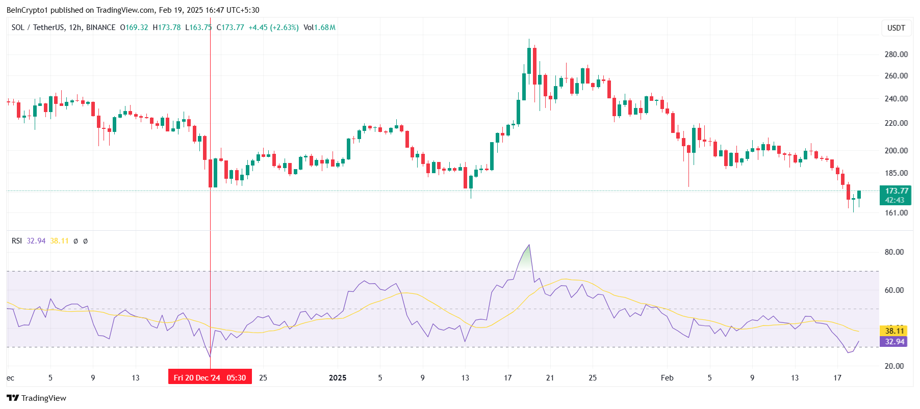واجه سعر سولانا تحديات كبيرة في الأشهر الأخيرة. بعد أن وصل إلى أعلى مستوى له على الإطلاق (ATH) عند 295$ في منتصف يناير، شهدت العملة البديلة اتجاهًا هبوطيًا ثابتًا، حيث يتم تداولها الآن حول 173$.