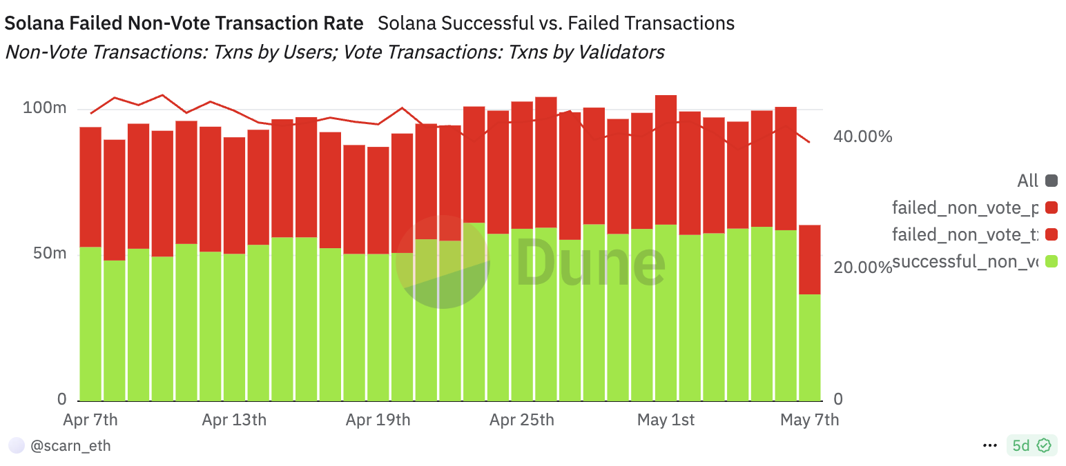 ومع ذلك، ليست كل الجوانب إيجابية. وفقًا لـ Dune Analytics، تواجه شبكة سولانا معدل فشل كبير في المعاملات، حيث تفشل ما يقرب من 40% من المعاملات غير التصويتية.
