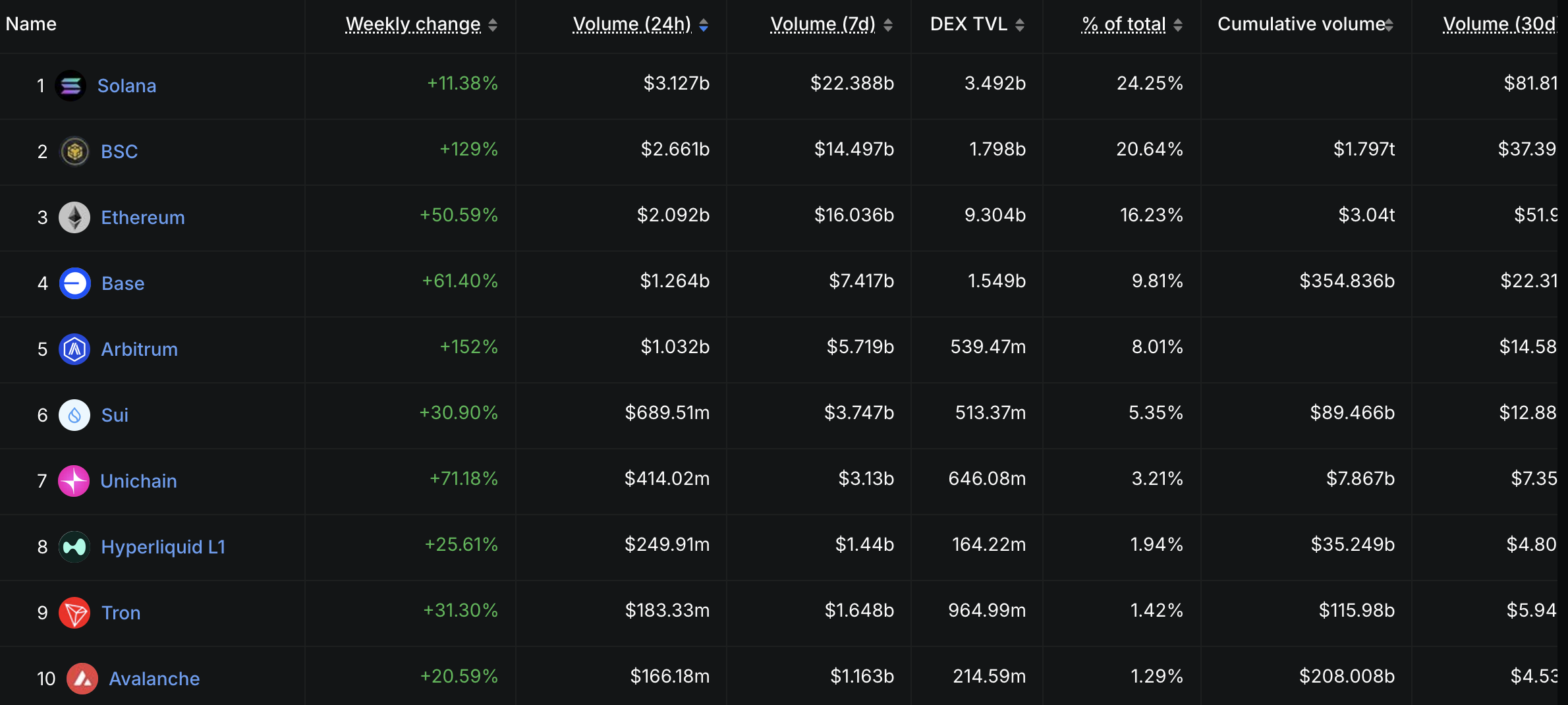 Sponsored Sponsoredتكشف البيانات من DeFiLlama أيضًا أن سولانا تحتل المرتبة الأولى في حجم تداول DEX. على مدار الثلاثين يومًا الماضية، عالجت شبكة سولانا أكثر من 81,8 مليار دولار في المعاملات، مستحوذة على حصة سوقية بنسبة 24,25%.