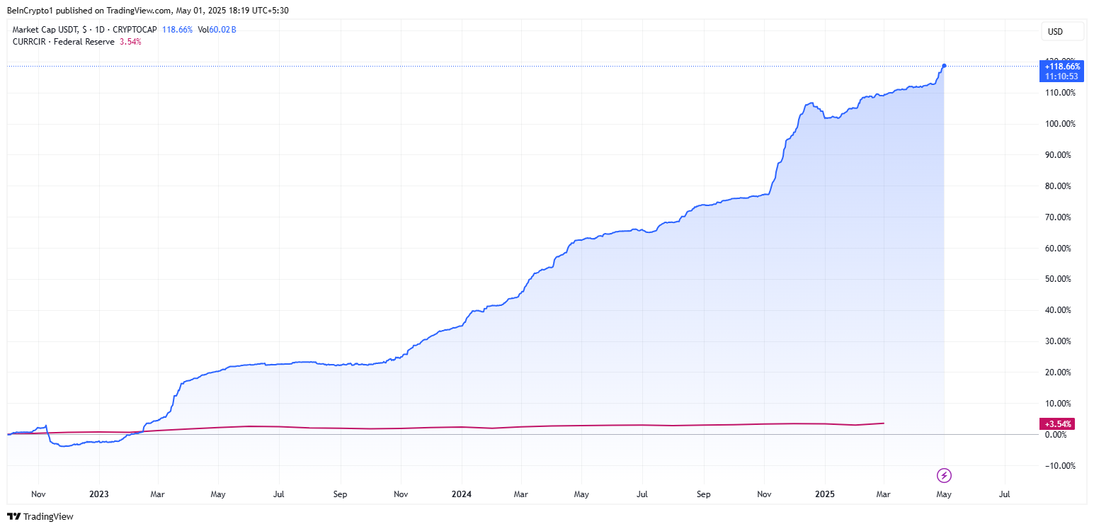 هذا يوضح الارتفاع السريع للعملات المستقرة بالنسبة للدولار الأمريكي، مما يبرز هيمنتها المتزايدة في السوق.
