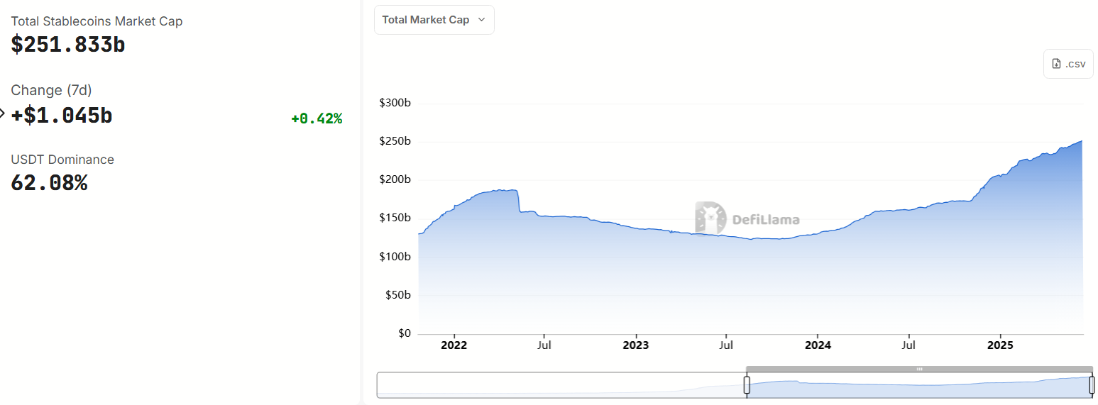 وفقًا لـDeFiLlama، تجاوز إجمالي القيمة السوقية للعملات المستقرة 251 مليار دولار في يونيو.