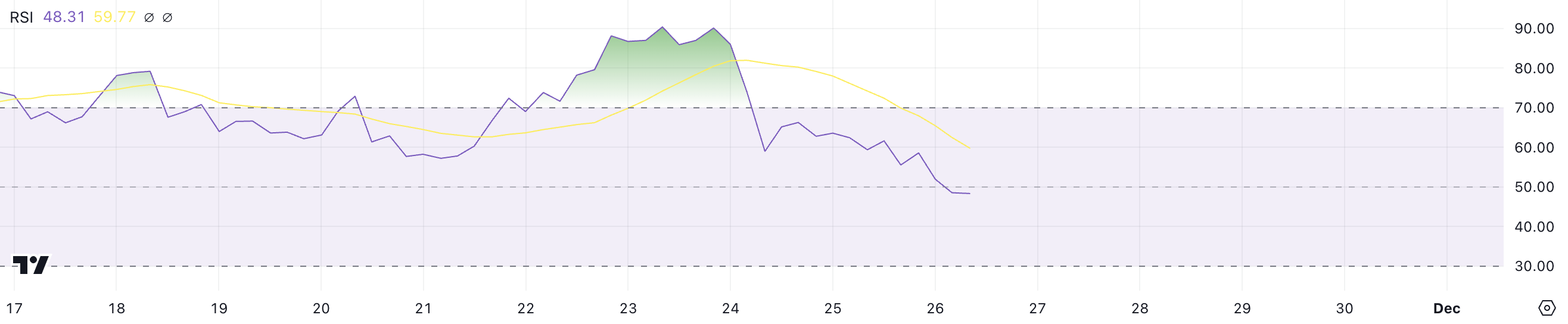 ستيلر RSI الآن عند 48,31، منخفضًا من فوق 70 عندما وصل XLM إلى $0,60، وهو أعلى سعر له في ثلاث سنوات. يقيس RSI، أو مؤشر القوة النسبية، الزخم على مقياس من 0 إلى 100، مع القيم فوق 70 تشير إلى ظروف شراء مفرطة وتحت 30 تشير إلى ظروف بيع مفرطة.