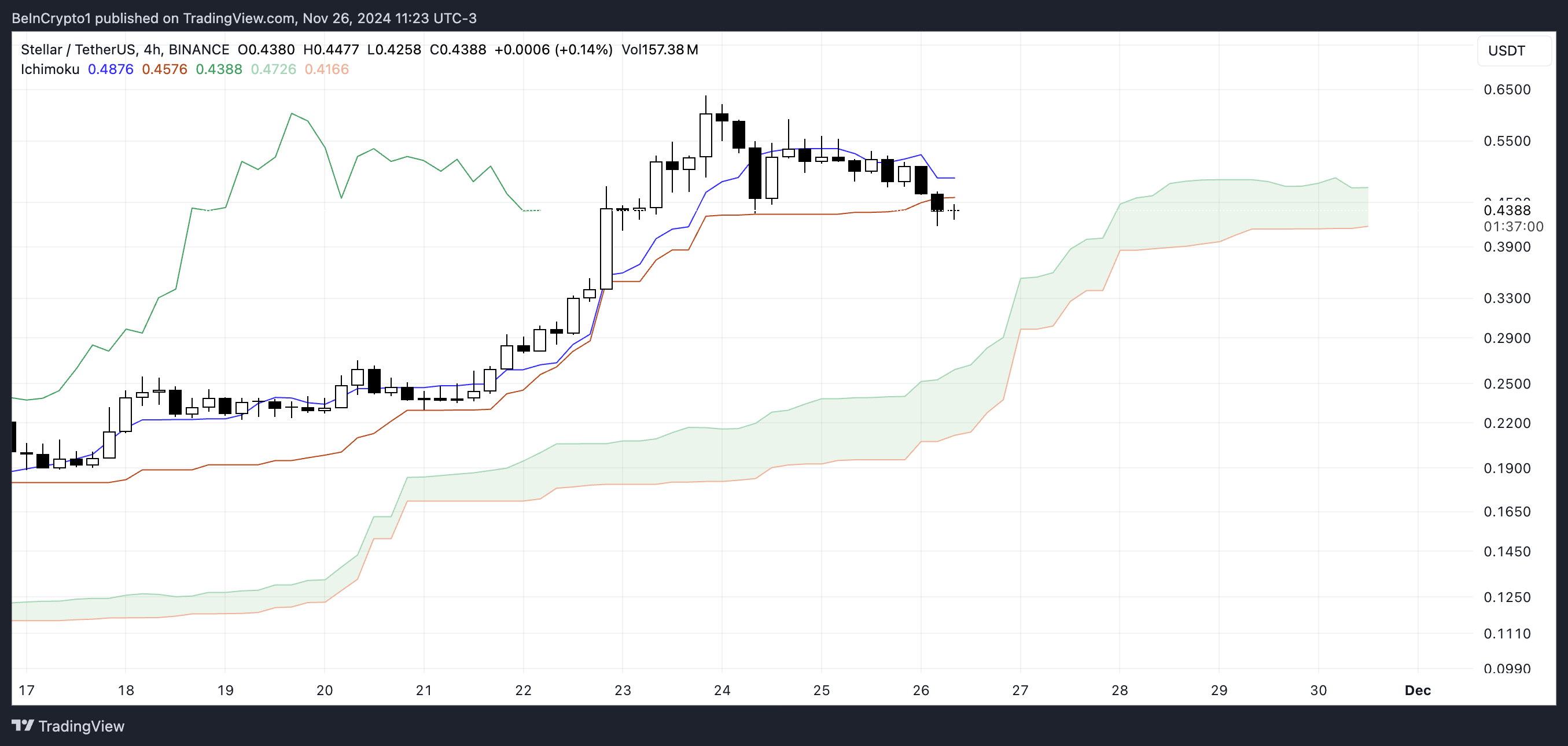 يظهر مخطط Ichimoku Cloud لـ ستيلر أن الزخم الهبوطي يسيطر حيث تحرك السعر تحت Kijun-Sen (الخط البرتقالي) وTenkan-Sen (الخط الأزرق).