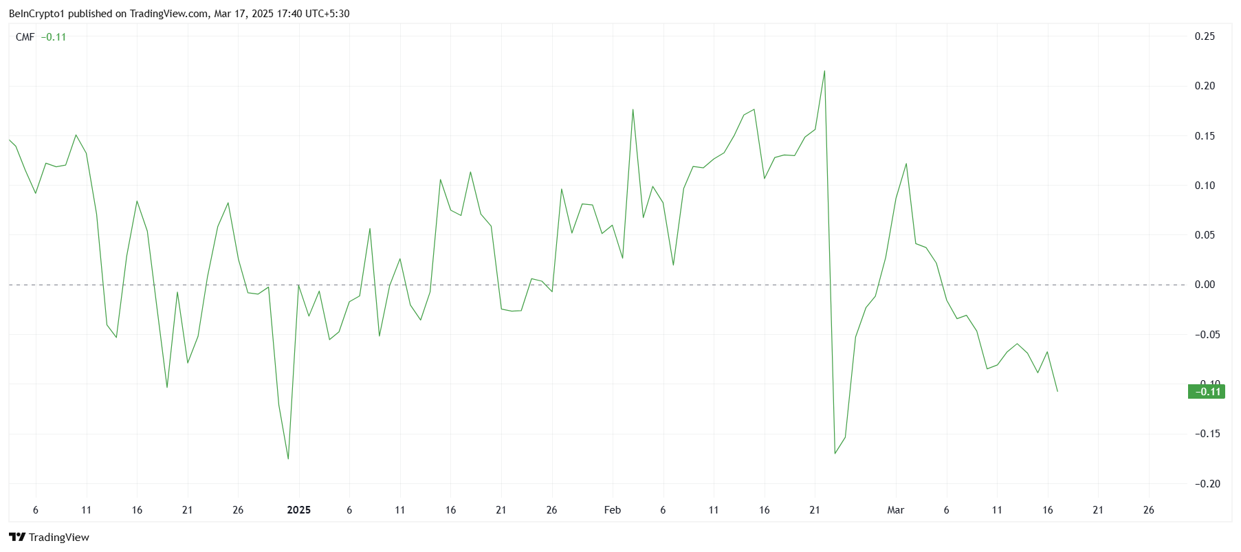 الزخم الكلي لستيلر يعكس أيضًا نظرة هبوطية. مؤشر تدفق المال تشايكين (CMF)، الذي يتتبع تراكم وتوزيع الأصول، يظهر انخفاضًا حادًا هذا الشهر. حاليًا، تحت خط الصفر بشكل كبير، يشير هذا إلى أن التدفقات الخارجة تهيمن على التدفقات الداخلة، مما يشير إلى أن المستثمرين يسحبون أموالهم من XLM.