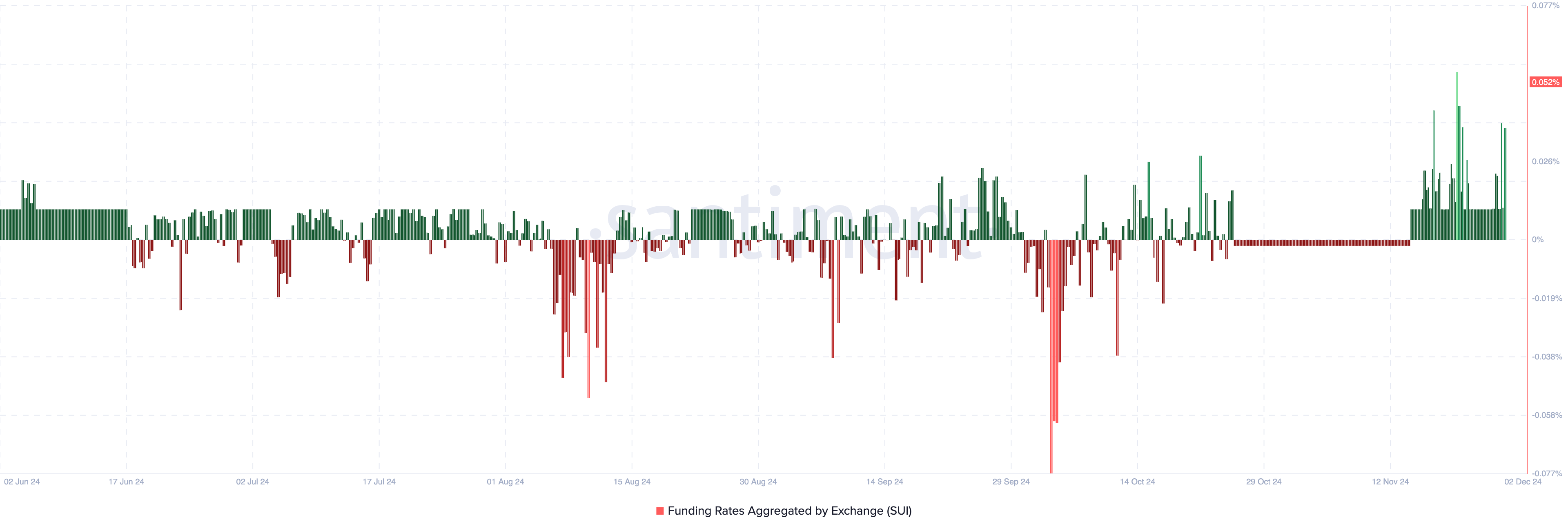 بعد التطور، تظهر بيانات من Santiment أن معدل تمويل SUI إيجابي. يظهر معدل التمويل ما إذا كان المتداولون في المراكز الطويلة يدفعون للقصيرة للحفاظ على مراكزهم مفتوحة أو العكس.