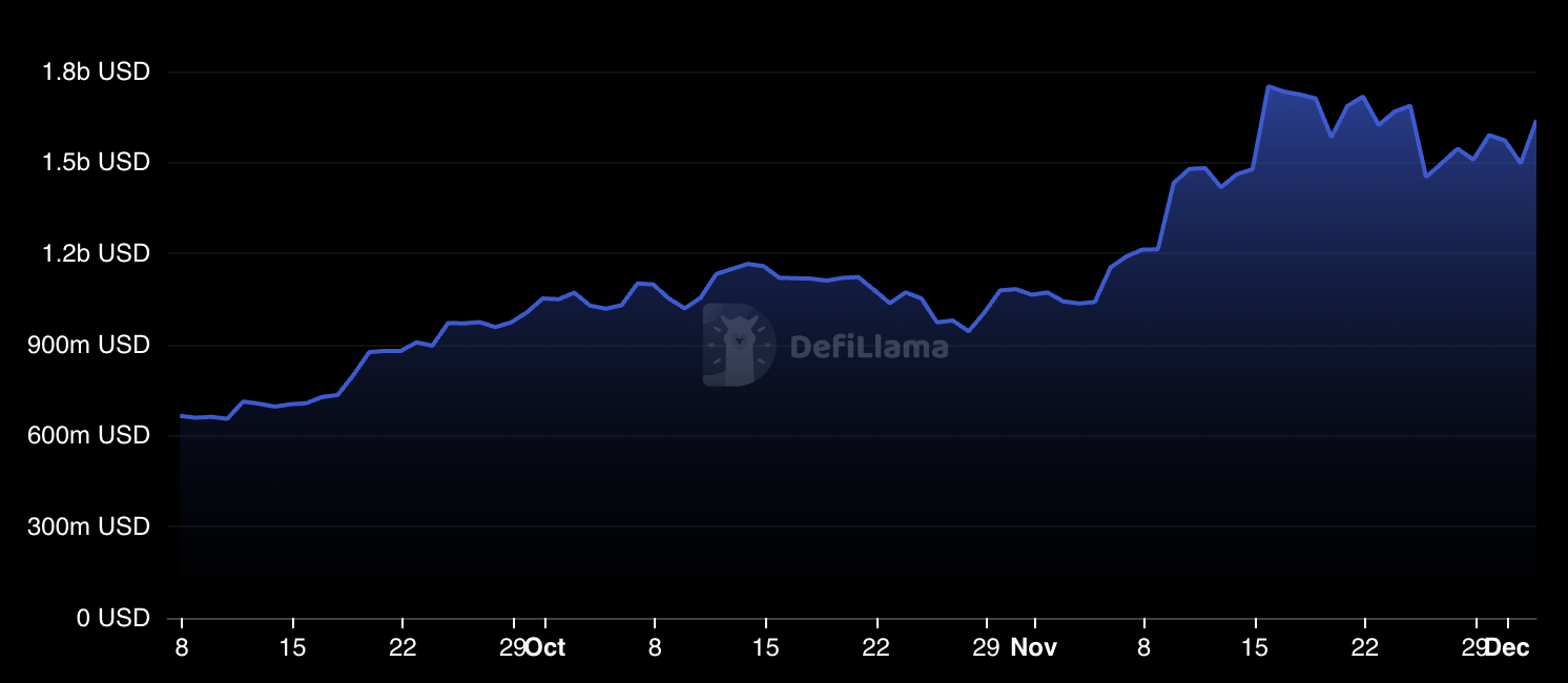تشير القيمة الإجمالية المقفلة، التي تبلغ حاليًا ١,٤٥ مليار دولار و١,٦٤ مليار دولار، إلى أن النمو مستدام وليس مضاربيًا. عادةً ما يرتبط ارتفاع القيمة الإجمالية المقفلة بضغط سعري تصاعدي، حيث تقلل الأصول المقفلة من العرض المتداول بينما تزيد من فائدة الشبكة.