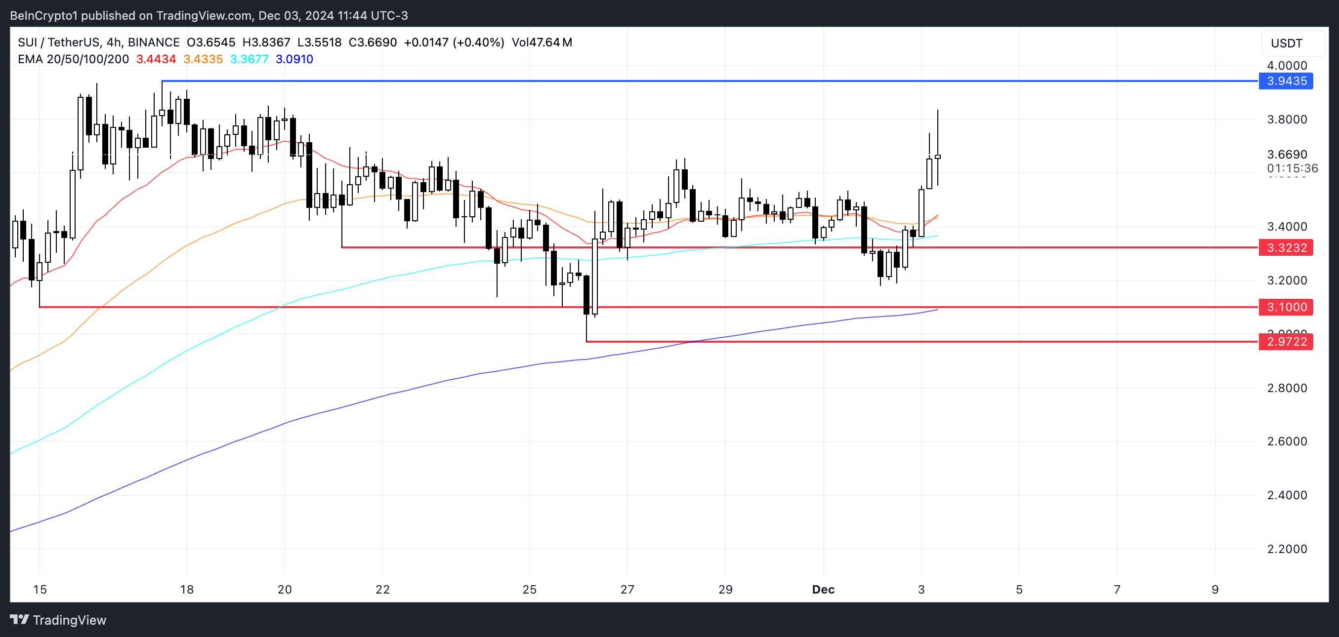 يظهر سعر SUI حاليًا زخمًا صعوديًا قويًا مع محاذاة خطوط المتوسط المتحرك الأسي (EMA) في نمط ملائم.