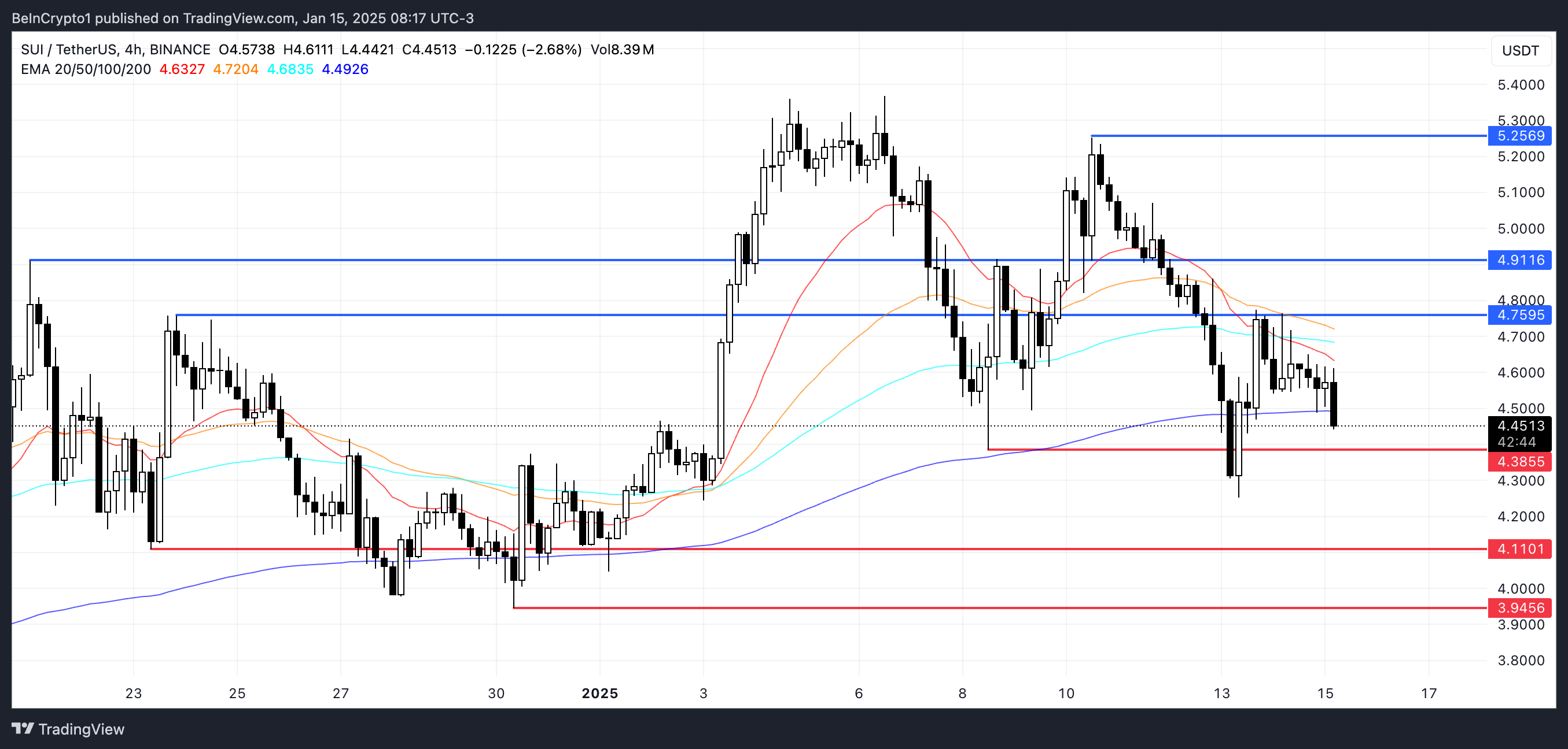 إذا استمر الاتجاه الهبوطي الحالي، قد يختبر SUI الدعم عند $4,38. الفشل في الحفاظ على هذا المستوى قد يؤدي إلى مزيد من الانخفاضات، مع $4,11 كدعم رئيسي تالي. كسر هذا المستوى قد يدفع SUI إلى ما دون عتبة $4، لاختبار $3,94.