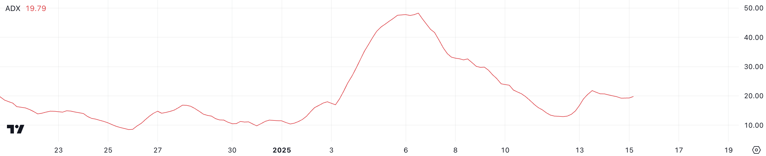 ارتفع سوي ADX إلى 19,7 من 12,9 خلال الأيام الثلاثة الماضية، مما يشير إلى تعزيز الاتجاه. بينما يشير ADX أقل من 20 إلى اتجاه ضعيف، فإن الحركة الصعودية تشير إلى أن الزخم يتزايد، على الرغم من أن الاتجاه الحالي هبوطي.