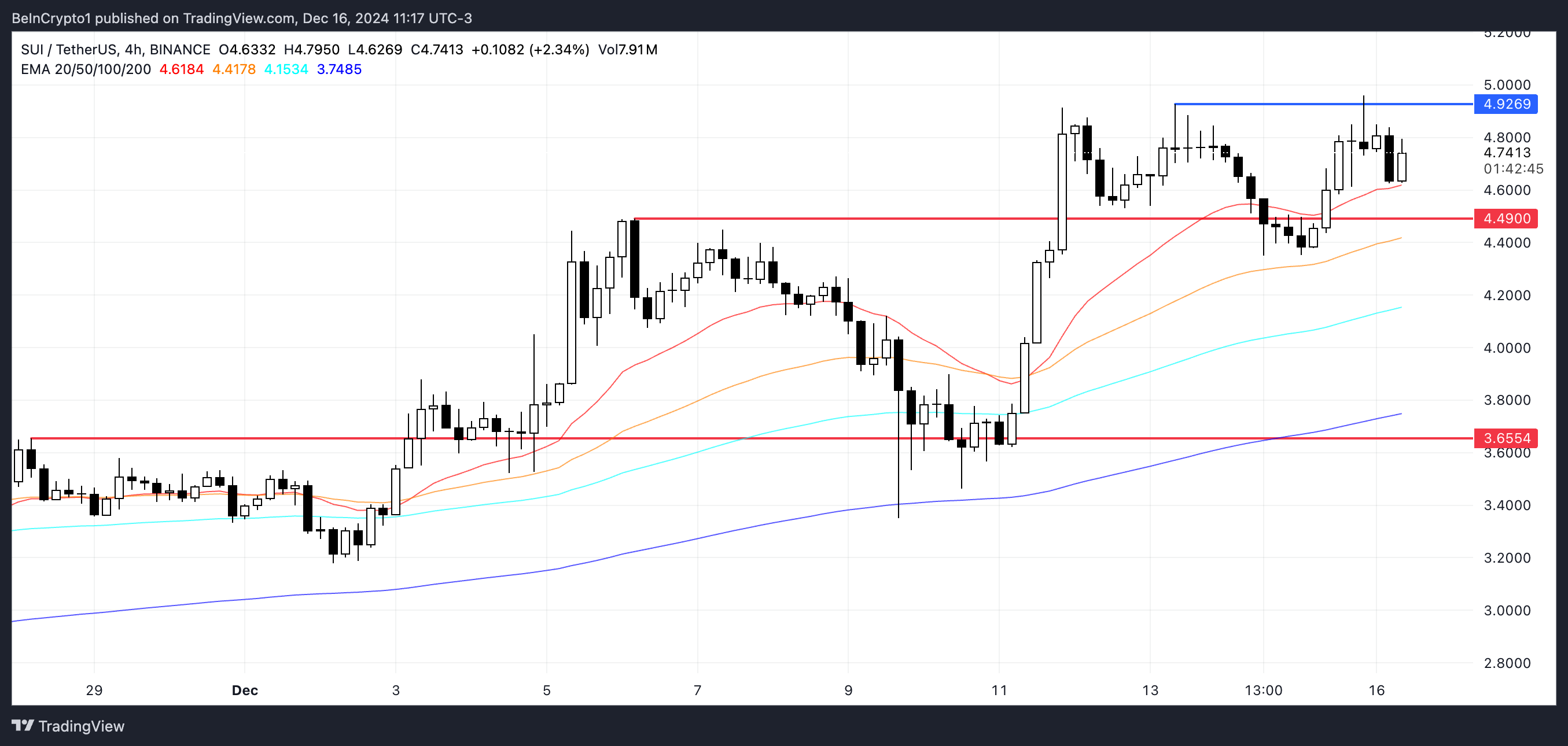 إذا استمر الاتجاه الصعودي وكسرت سعر SUI مقاومة 4,92$، فقد يختبر قريبًا علامة 5$، مما يحقق ارتفاعًا جديدًا على الإطلاق. مع كون SUI حاليًا أقل بـ 2% فقط من أعلى مستوى له على الإطلاق، يمكن أن يدفع الزخم الصعودي إلى مناطق غير مستكشفة.