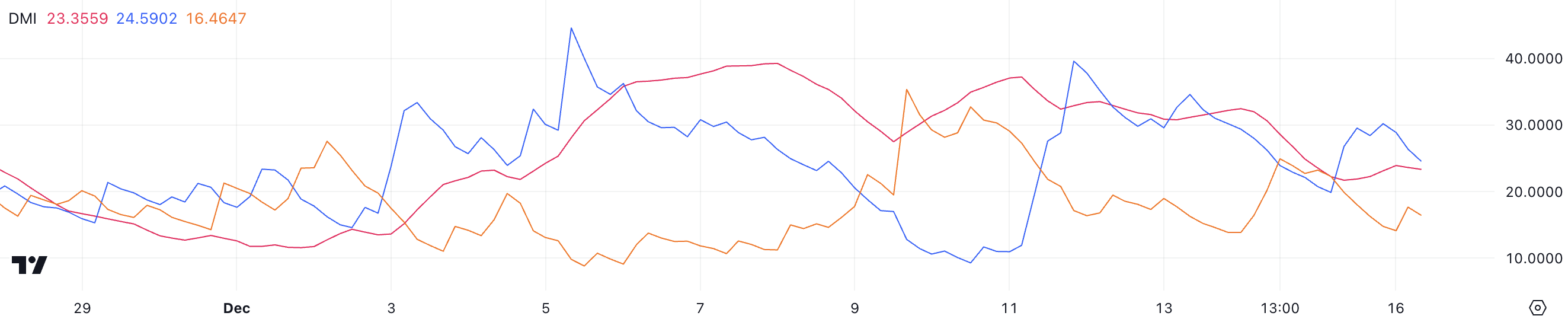 يظهر مخطط DMI أيضًا أن +DI (المؤشر الاتجاهي) عند 24,4، أعلى من -DI عند 16,3، مما يؤكد أن الاتجاه لا يزال صعوديًا. ومع ذلك، يشير انخفاض ADX إلى أن قوة هذا الاتجاه الصعودي تتناقص.