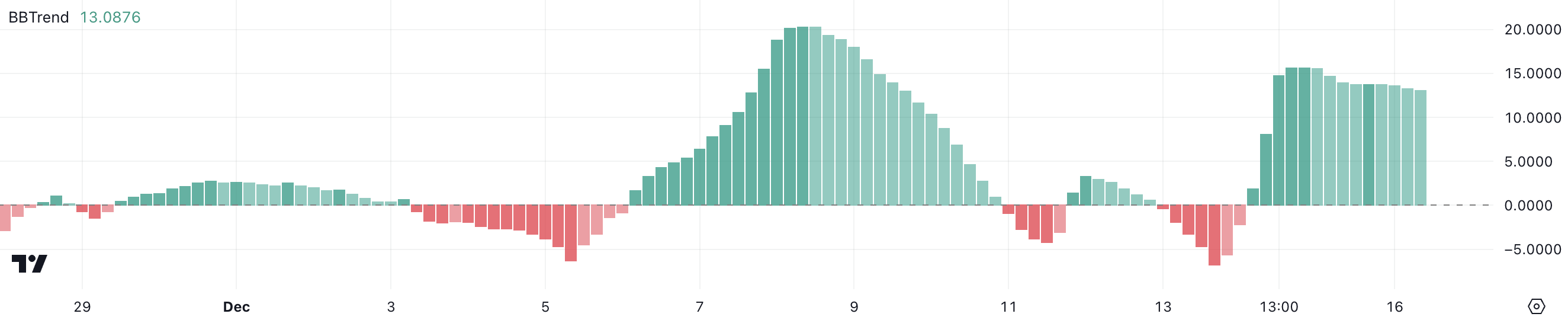 مؤشر BBTrend لـSUI حاليًا عند 13، محافظًا على المنطقة الإيجابية منذ 14 ديسمبر، بعد أن وصل إلى أدنى مستوى سلبي عند -6,74 في 13 ديسمبر.
