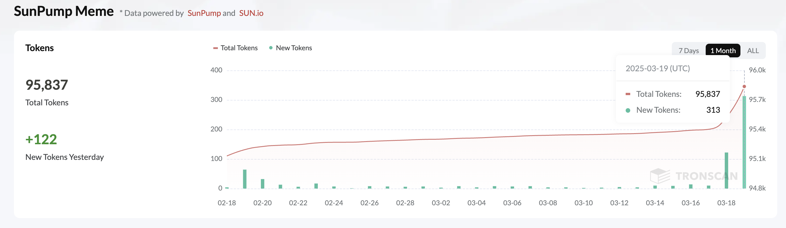 وفقًا لـالبيانات التي شاركها Onchain Lens على X (المعروف سابقًا بتويتر)، تم إنشاء أكثر من 220 عملة ميم جديدة على SunPump في 18 مارس.