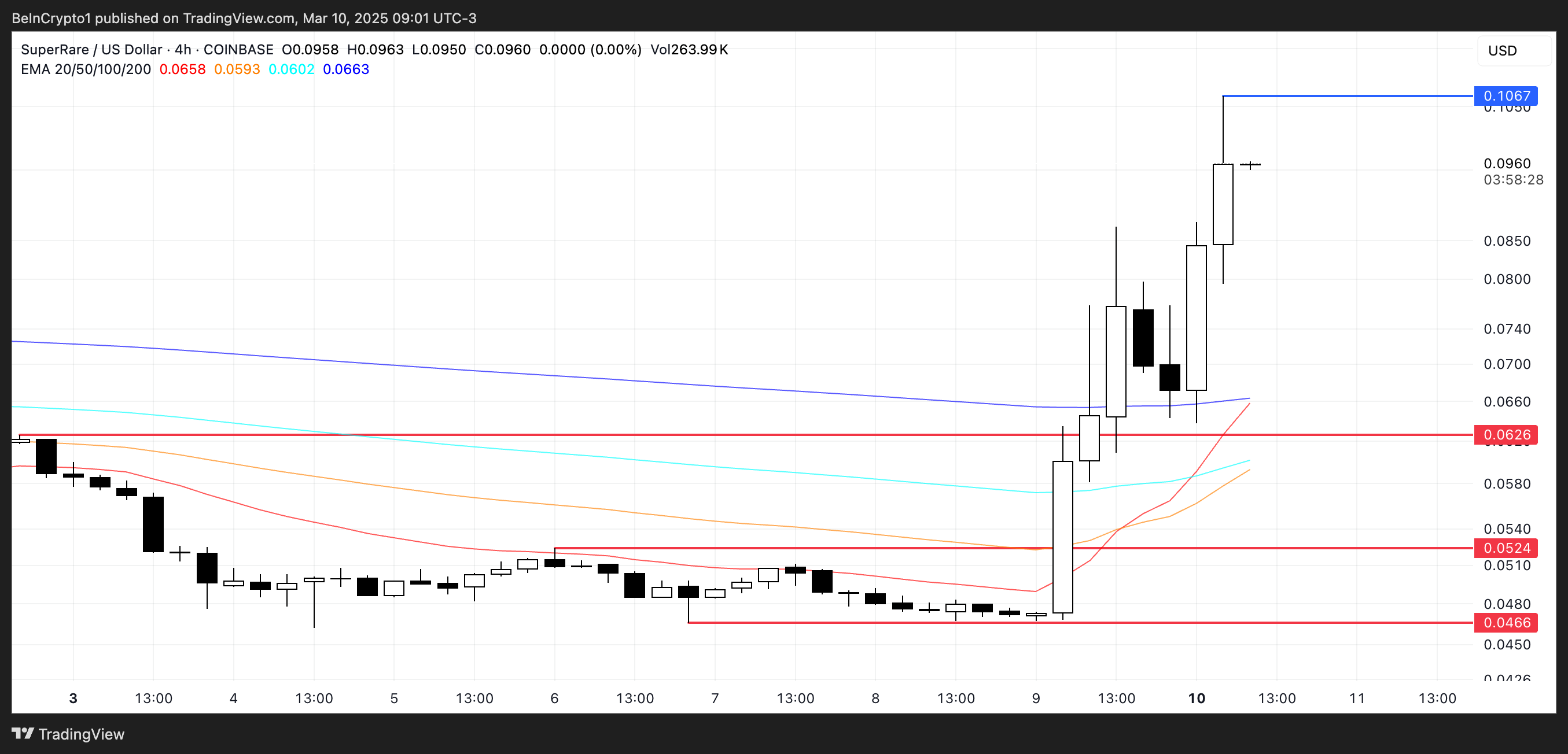 سعر SuperRare يقترب من تشكيل تقاطع ذهبي محتمل، حيث يمكن أن يتقاطع المتوسط المتحرك الأسي الأقصر مع المتوسط المتحرك الأسي الأطول، مما يشير إلى تحول في الاتجاه الصعودي.