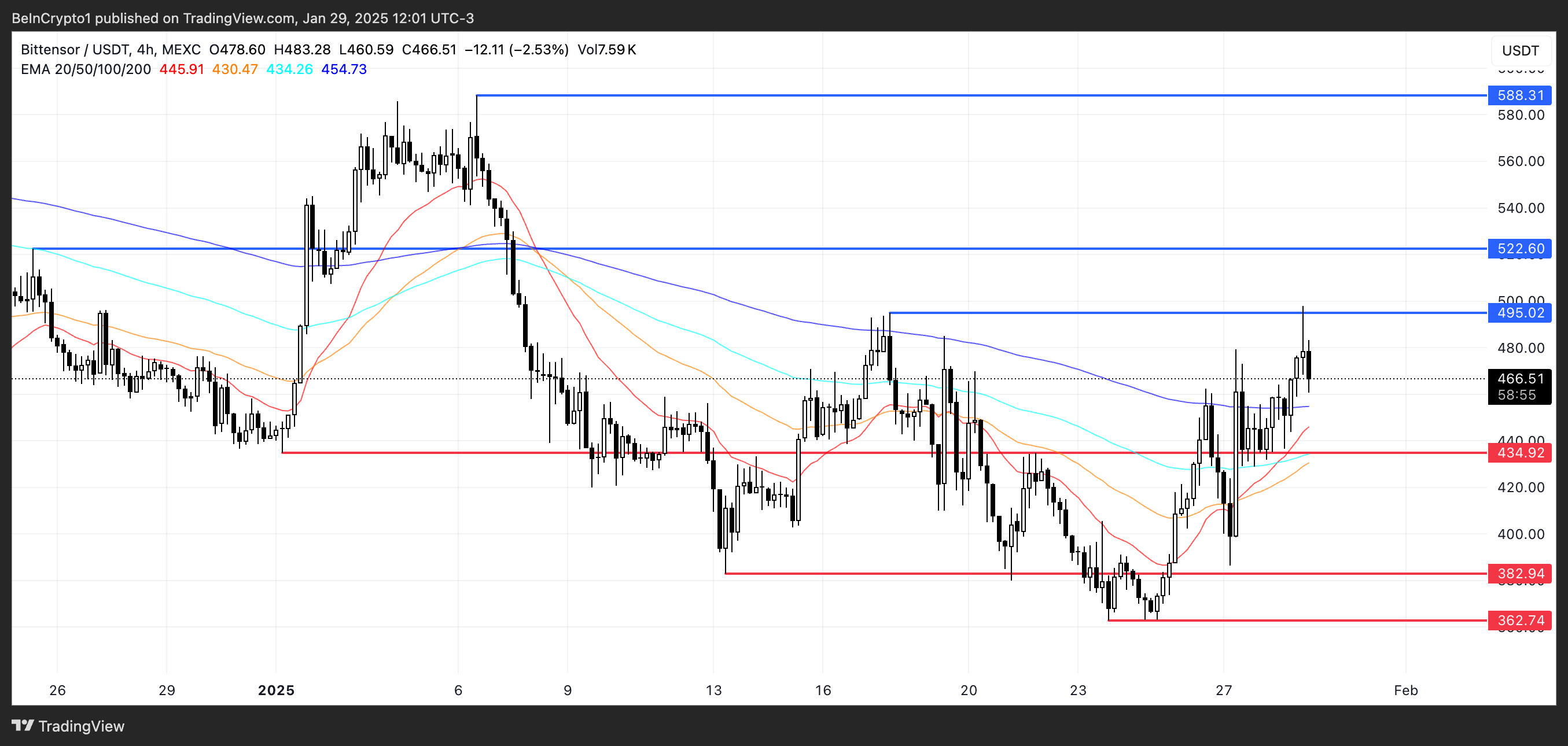 إذا تأكدت هذه الإشارة الصعودية، يمكن أن يكتسب TAO زخمًا ويختبر مستوى المقاومة $495. يمكن أن يدفع الاختراق فوق ذلك السعر نحو $522، وإذا ظل الاتجاه الصعودي قويًا، قد يرتفع سعر TAO إلى $588، مما يشير إلى ارتفاع محتمل بنسبة 26%.