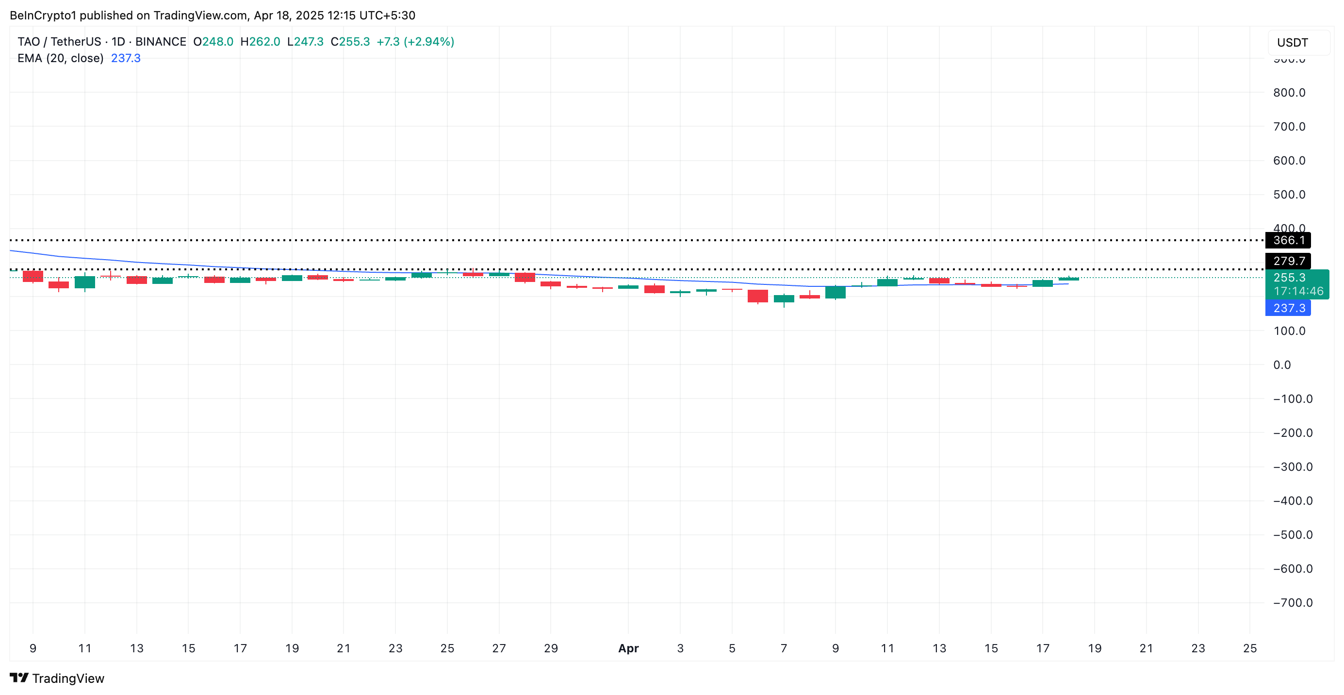 اخترق سعر عملة TAO فوق متوسطه المتحرك الأسي لمدة 20 يومًا (EMA)، وهو مؤشر يشير إلى اتجاه صعودي قوي في سوقه الفوري.