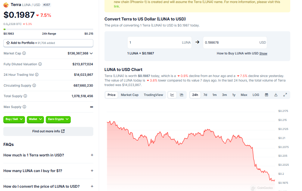 على الرغم من هذه الأخبار، انخفض سعر Terra Luna بنسبة تقارب ٨٪ في الـ٢٤ ساعة الماضية، حيث يتم تداوله بسعر ٠,١٩٨٧ دولار في وقت كتابة هذا التقرير. بنفس النغمة، انخفض سعر Terra Luna Classic بنسبة تقارب ٦٪ في الـ٢٤ ساعة الماضية. في وقت كتابة هذا التقرير، كان يتم تداول LUNC بسعر ٠,٠٠٠٠٦٢٥٣ دولار على CoinGecko.