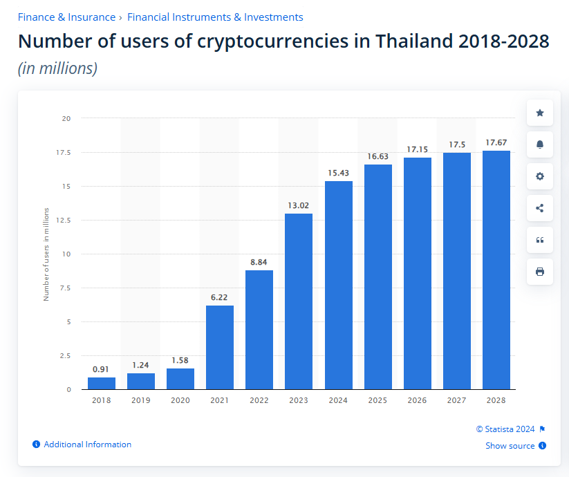 بالإضافة إلى ذلك، تظهر بيانات من ستاتيستا أن عدد مستخدمي العملات الرقمية في تايلاند في عام 2024 سيكون حوالي 15,43 مليون، مما يشكل أكثر من 21% من السكان. تتوقع ستاتيستا أن معدل نمو مستخدمي العملات الرقمية في تايلاند سيتباطأ خلال السنوات الأربع القادمة، ليصل إلى 17,67 مليون بحلول عام 2028.