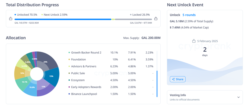Sponsoredيمتلك Galxe إجمالي معروض يبلغ 200 مليون رمز GAL، مع 70,5% من الرموز، حوالي 127,7 مليون حاليًا في التداول. في 5 فبراير، ستفتح الشبكة 5,18 مليون رمز GAL إضافي.