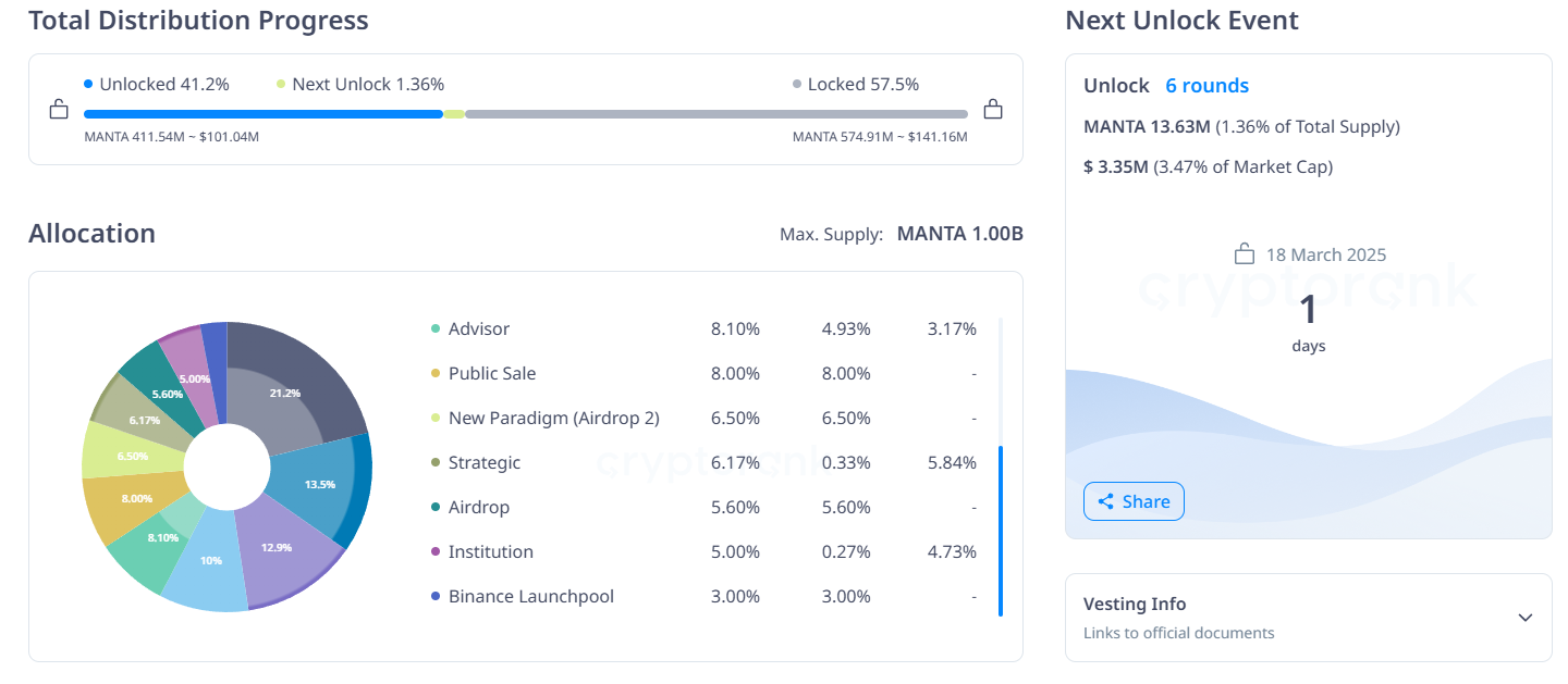 - عدد الرموز التي سيتم فتحها: 13,63 مليون MANTA (1,36% من الحد الأقصى للإمداد)