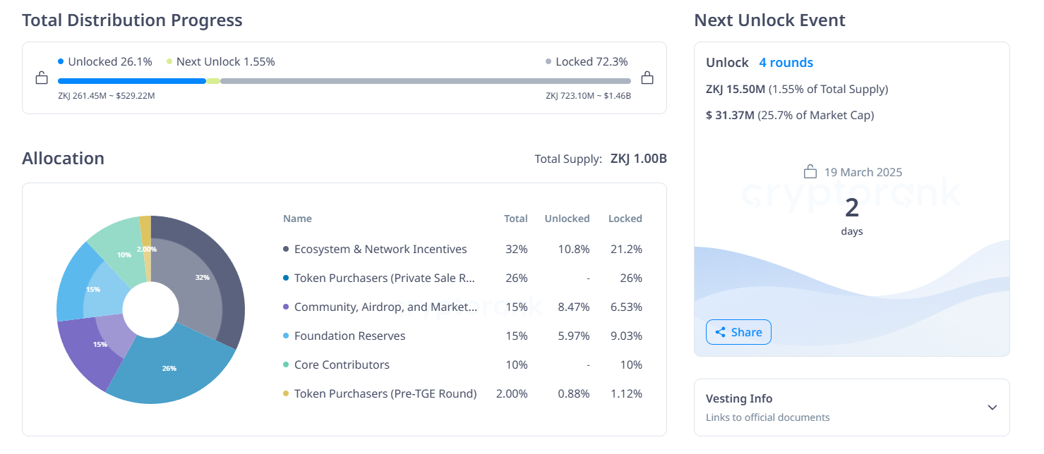 في 19 مارس، سيتم فتح 15,50 مليون رمز ZKJ، بقيمة 31,38 مليون دولار. تشمل التخصيصات 8,47 مليون رمز (2,65%) لحوافز الشبكة. المجتمع، والإسقاط الجوي، والتسويق يحصلون على 2,61 مليون رمز (1,74%).
