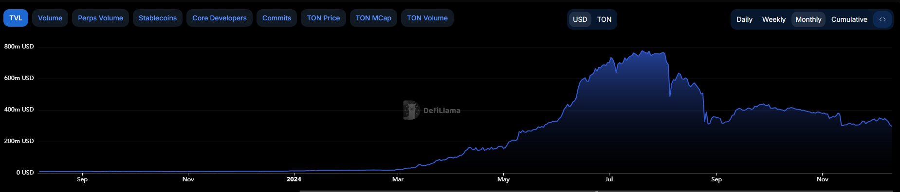 في الوقت نفسه، تواصل تون النضال بعد الضجة الأولية لألعاب تيليجرام الربحية التي تستمر في التلاشي. انخفضت القيمة الإجمالية المقفلة للبلوكتشين من ذروة بلغت ما يقرب من 760 مليون دولار في يوليو إلى 296 مليون دولار في ديسمبر.