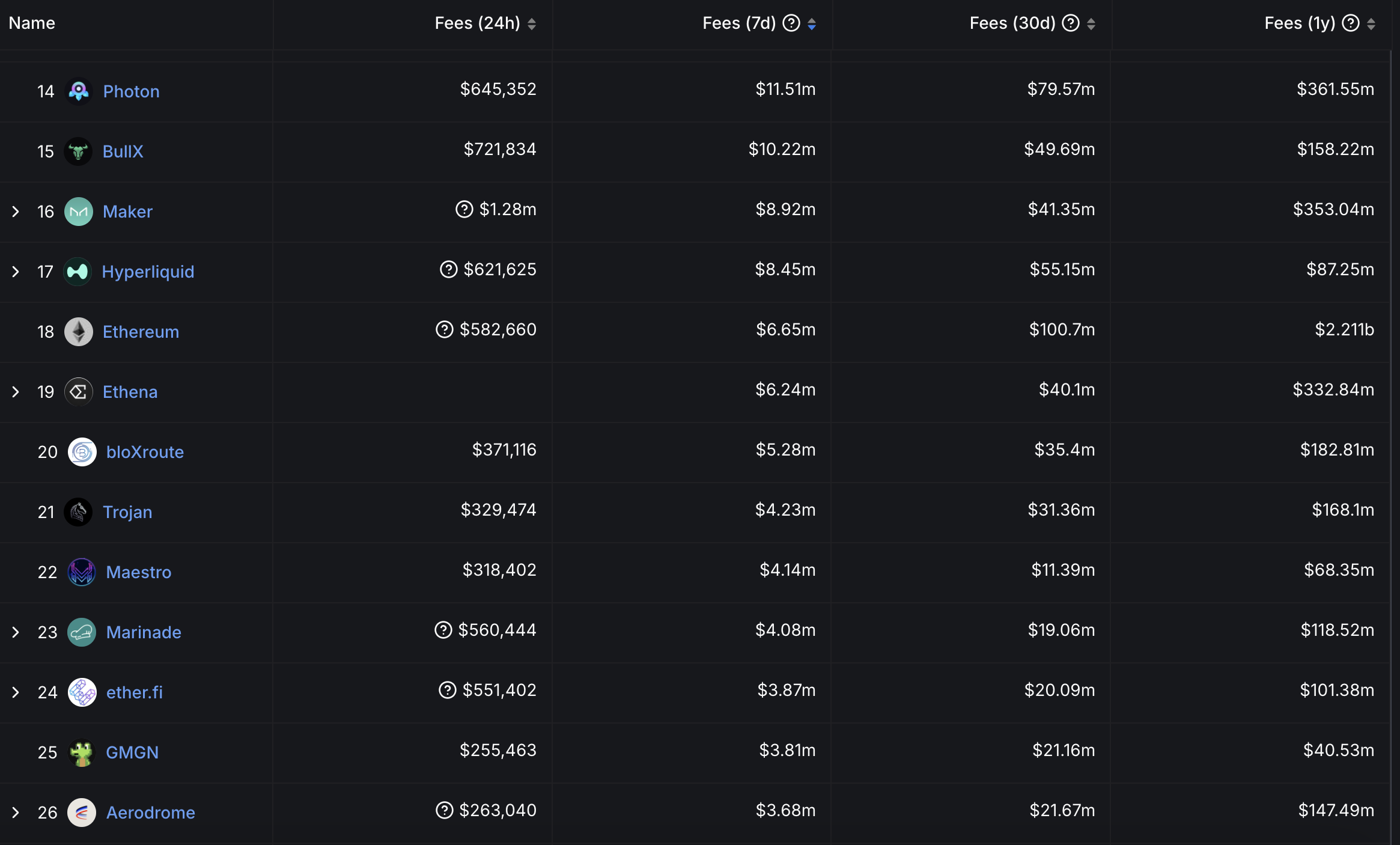 تبقى روبوتات التداول مربحة للغاية، حيث تولد Photon وBullX رسومًا أكثر من إيثريوم في الأيام السبعة الماضية. في الوقت نفسه، تشهد منصات العقود الدائمة اهتمامًا متجددًا، حيث تقود HYPE الفئة وتحافظ Hyperliquid على هيمنتها في توليد الإيرادات.
