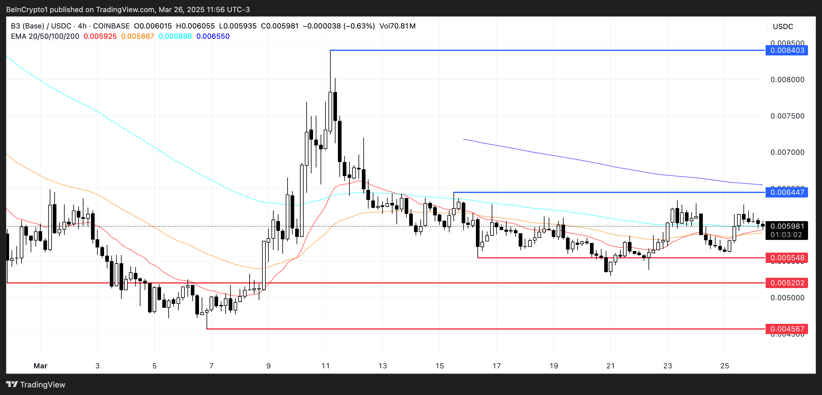 إذا عاد الزخم، يمكن أن يدفع B3 نحو المقاومة عند $0,0064، مع احتمال أن يرسله الاختراق إلى $0,0084.