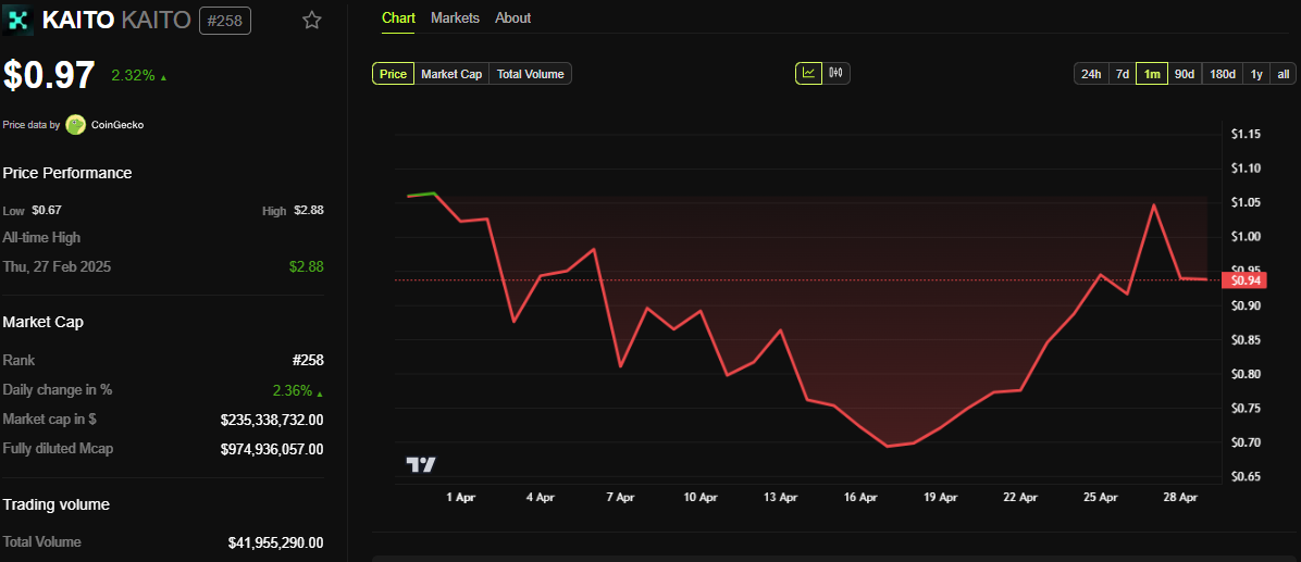 مع سعر KAITO عند $0,97 و235 مليون دولار كقيمة سوقية، يمكن أن يؤدي الترقية إلى زيادة التبني والسيولة، رغم أن مخاطر تخفيف الرموز تبقى مع وجود حد أقصى للإمداد يبلغ 1 مليار.
