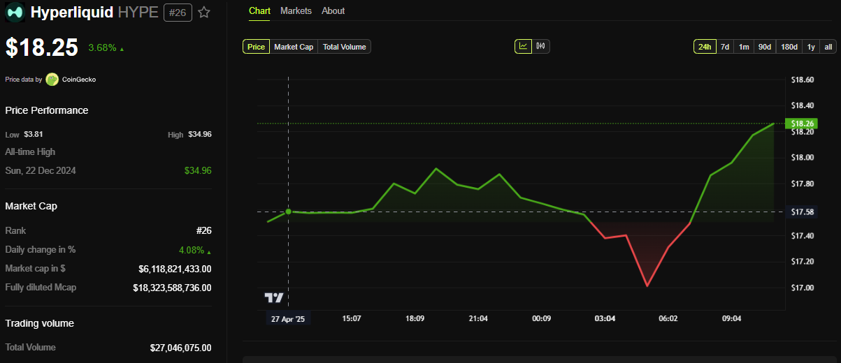 تظهر بيانات BeInCrypto أن رمز HYPE الخاص بـ Hyperliquid كان يتداول بسعر 18,25 دولارًا في وقت كتابة هذا التقرير، بزيادة تقارب 4% في آخر 24 ساعة.