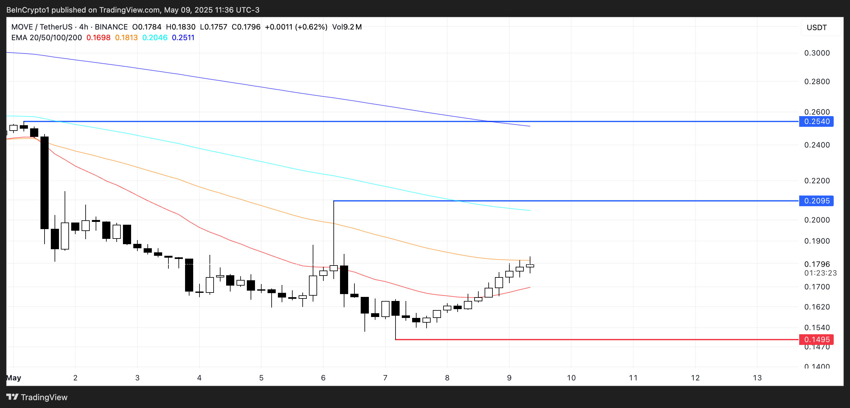 إذا تحسنت المعنويات واستعيدت الثقة، يمكن أن يرتفع MOVE لاختبار المقاومة عند $0,209، مع إمكانية الارتفاع إلى $0,254 إذا استمر الزخم.