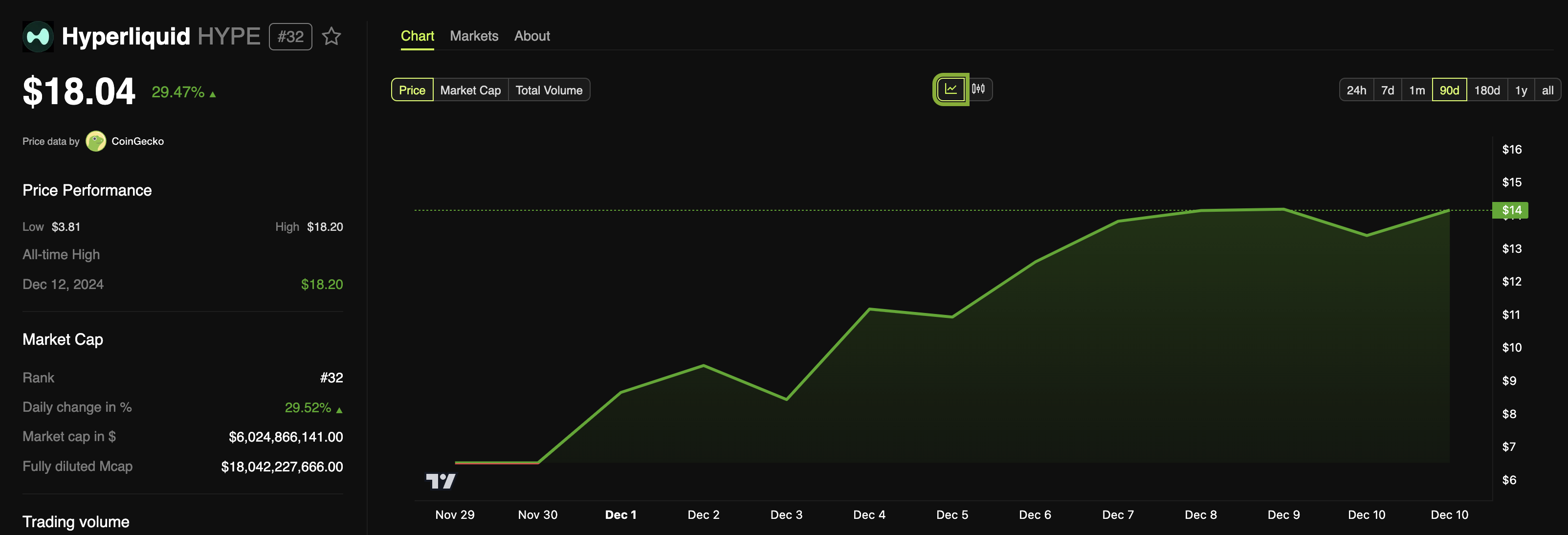 تحديدًا، زادت قيمة HYPE بنسبة 464,50% منذ تلك الفترة، مع 30% من ذلك في الـ 24 ساعة الماضية. كما ارتفع حجم التداول خلال تلك الفترة إلى أكثر من 230 مليون دولار، مما يشير إلى أن التفاعل على السلسلة لا يزال في مستوى مثير للإعجاب للغاية.