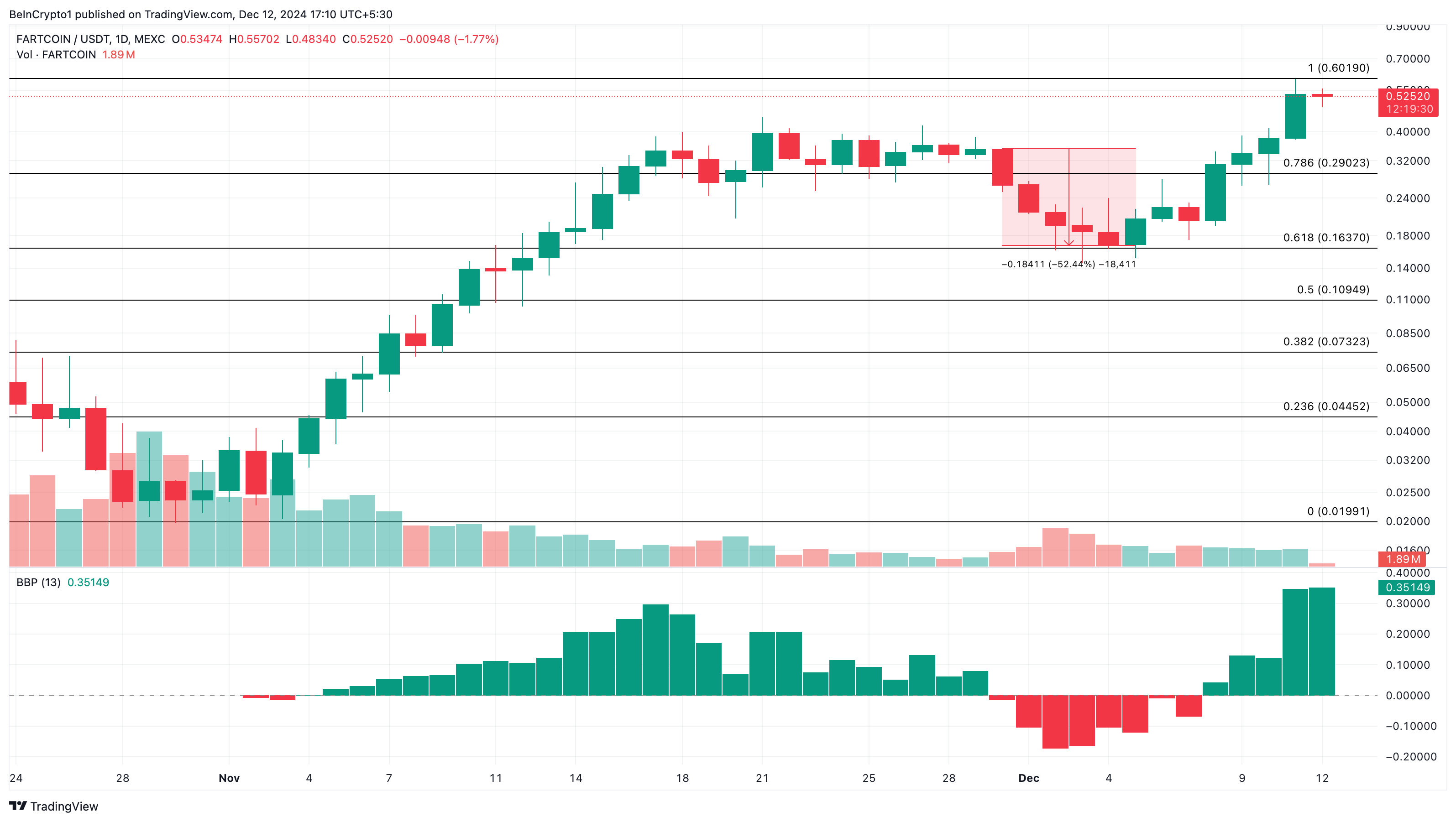يظهر مؤشر Bull Bear Power (BBP) أن المشترين قد عكسوا الاتجاه، مع وصول FARTCOIN الآن إلى $0,52. إذا استمر BBP في الصعود، فقد تصل قيمة FARTCOIN إلى $0,60 في المدى القصير.