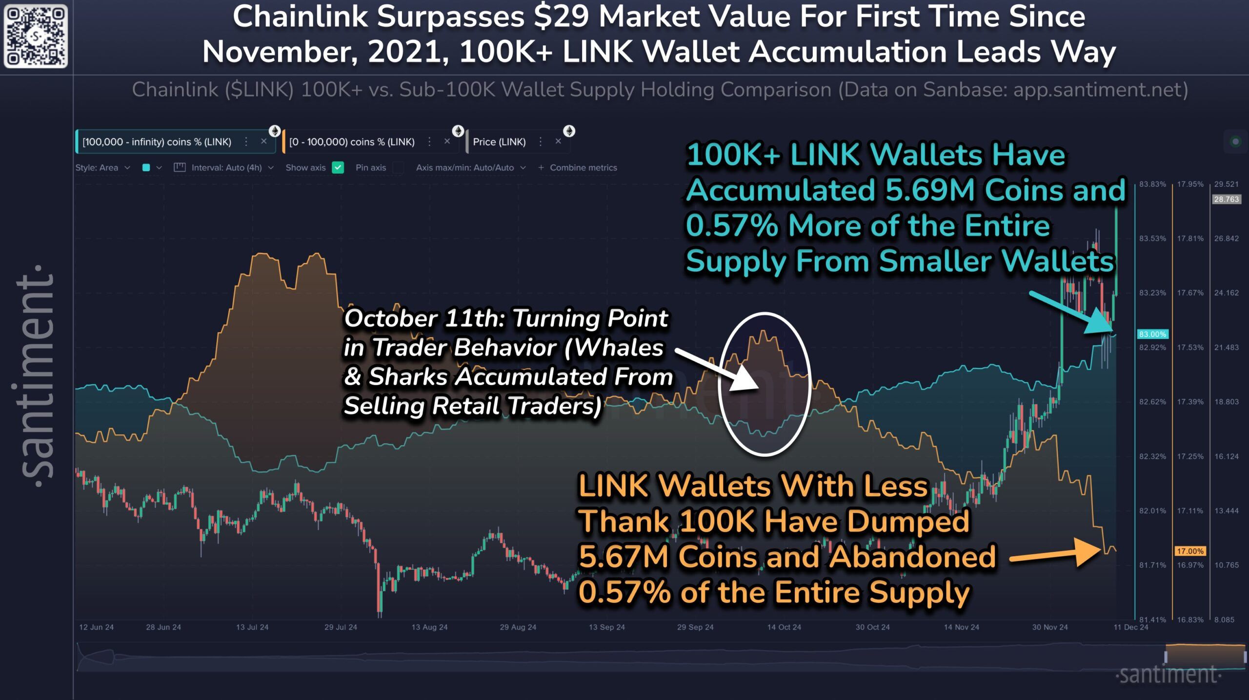 “على مدار تاريخ العملات المشفرة، عادةً ما يكون جمع المحافظ الكبيرة للعملات من المتداولين الأفراد غير الصبورين أو المذعورين وصفة لارتفاع القيمة السوقية. بالطبع، سيظل نجاح العملات البديلة ذات القيمة السوقية الكبيرة مثل Chainlink يعتمد على قدرة بيتكوين على البقاء مدعومة. إذا حدث ذلك، فهناك علامات قوية على أن الحاملين الصبورين سيكافؤون على المدى الطويل”، أشار Santiment على X (المعروف سابقًا بتويتر).