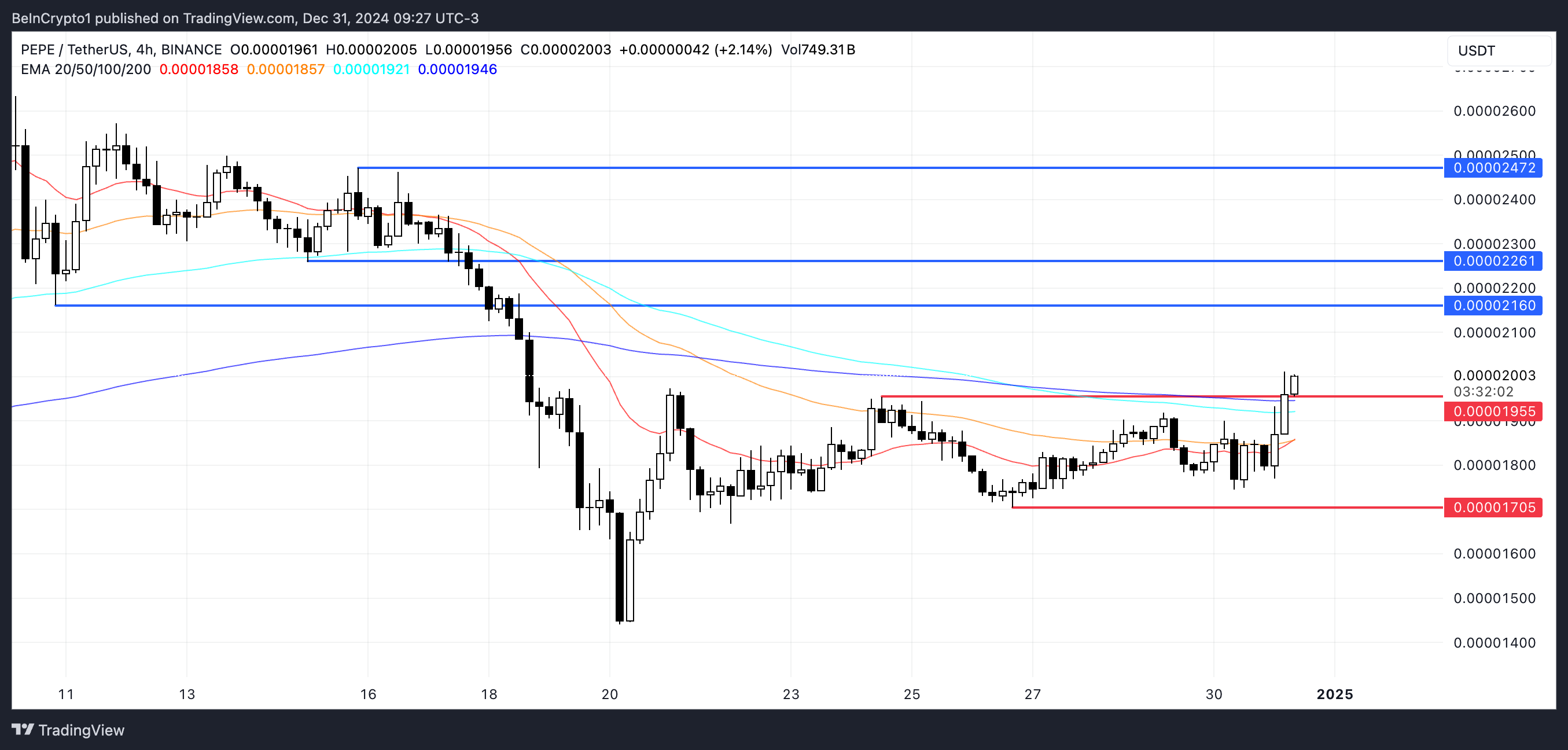 ومع ذلك، إذا تعثر الاتجاه الصعودي وفقد PEPE الدعم الحرج عند $0,00001955، فقد ينخفض نحو $0,000017. من المرجح أن تحدد هذه المستويات الرئيسية مسار سعر PEPE مع اقتراب نهاية عام 2024.