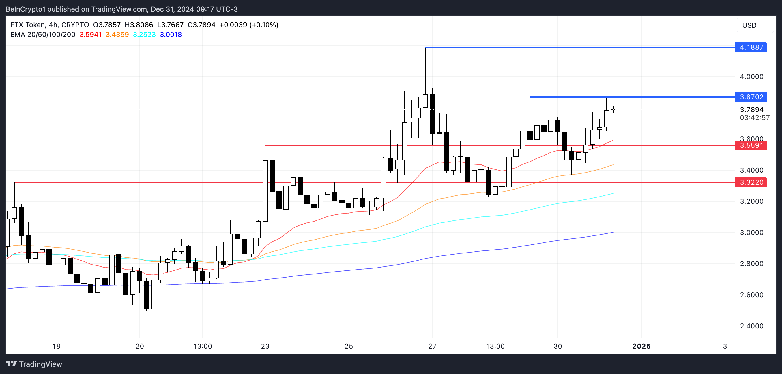 حاليًا، ارتفعت عملة FTX بأكثر من 7% في الـ24 ساعة الماضية، مما يعكس الشعور الإيجابي المدفوع بالأخبار الأخيرة. إذا تمكن الرمز من اختراق المقاومة عند $3,87، فقد يمهد الطريق لمزيد من الارتفاع نحو $4,18.