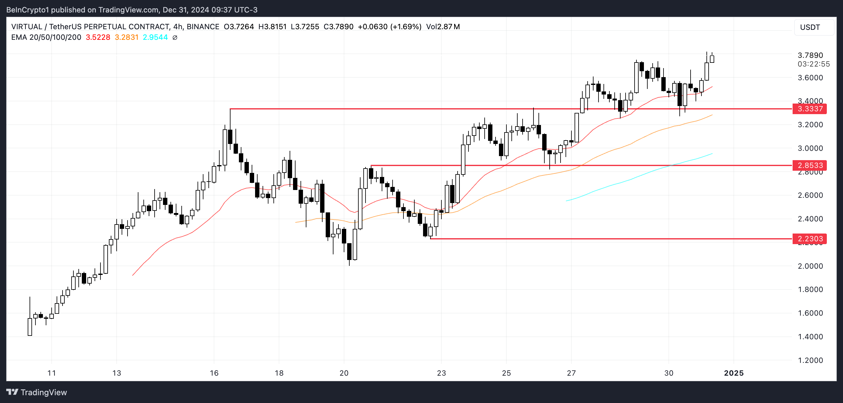 إذا استمر الاتجاه الصعودي الحالي، يمكن أن يختبر VIRTUAL عتبات رئيسية عند $3,85 أو حتى $4، مما يمثل معالم هامة في صعوده المستمر. ومع ذلك، إذا تضاءل الحماس حول الذكاء الاصطناعي أو وكلاء الذكاء الاصطناعي في العملات الرقمية المشفرة، قد يواجه سعر الرمز تراجعًا، مع احتمال اختبار مستوى الدعم عند $3,33.