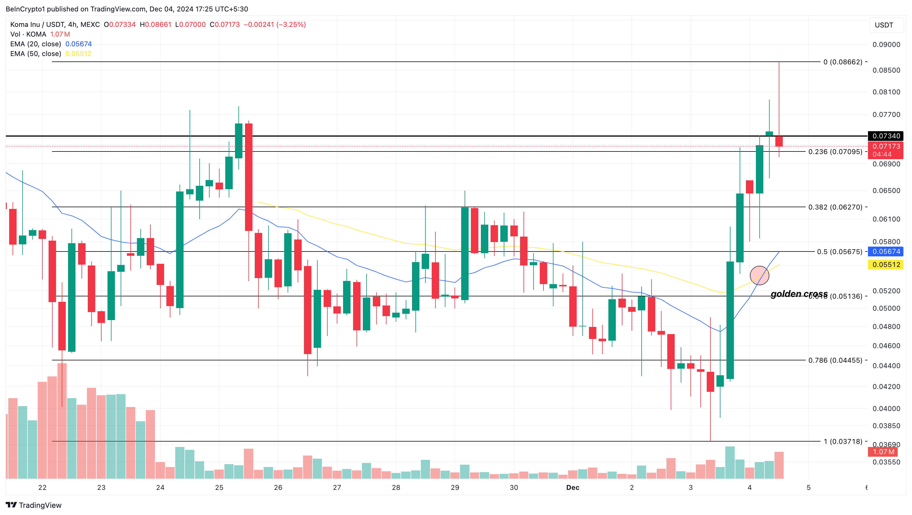 على الرسم البياني لأربع ساعات، شكلت كوما إينو تقاطعًا ذهبيًا. يحدث التقاطع الذهبي عندما يرتفع المتوسط المتحرك الأسي الأقصر (EMA) فوق المتوسط المتحرك الأسي الأطول. كما هو موضح أدناه، تجاوز المتوسط المتحرك الأسي 20 (الأزرق) المتوسط المتحرك الأسي 50 (الأصفر).