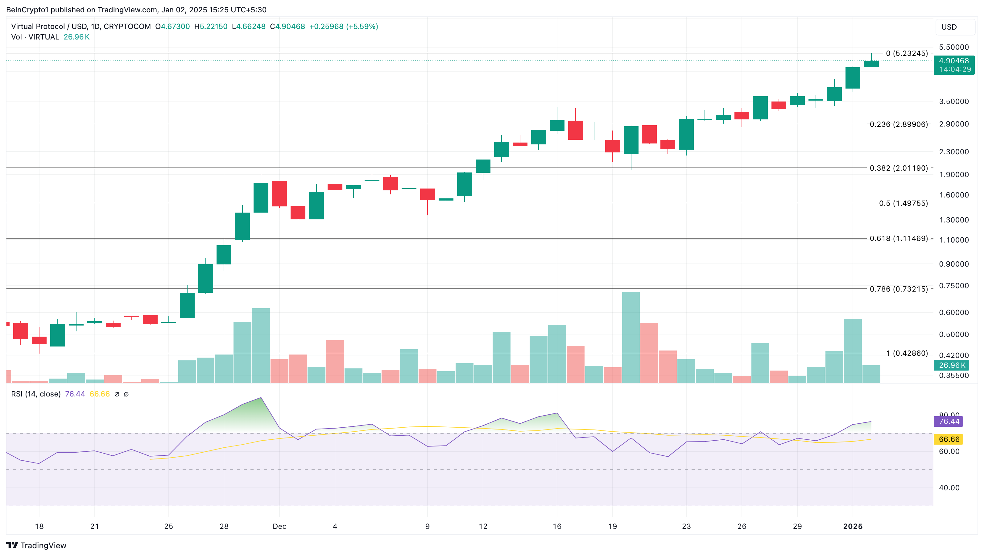 على الرسم البياني اليومي، تواصل VIRTUAL تحقيق ارتفاع أعلى، مما يشير إلى طلب ملحوظ على العملة الرقمية البديلة. كما زادت قراءة مؤشر القوة النسبية (RSI)، مما يشير إلى زخم صعودي ملحوظ حول الرمز.