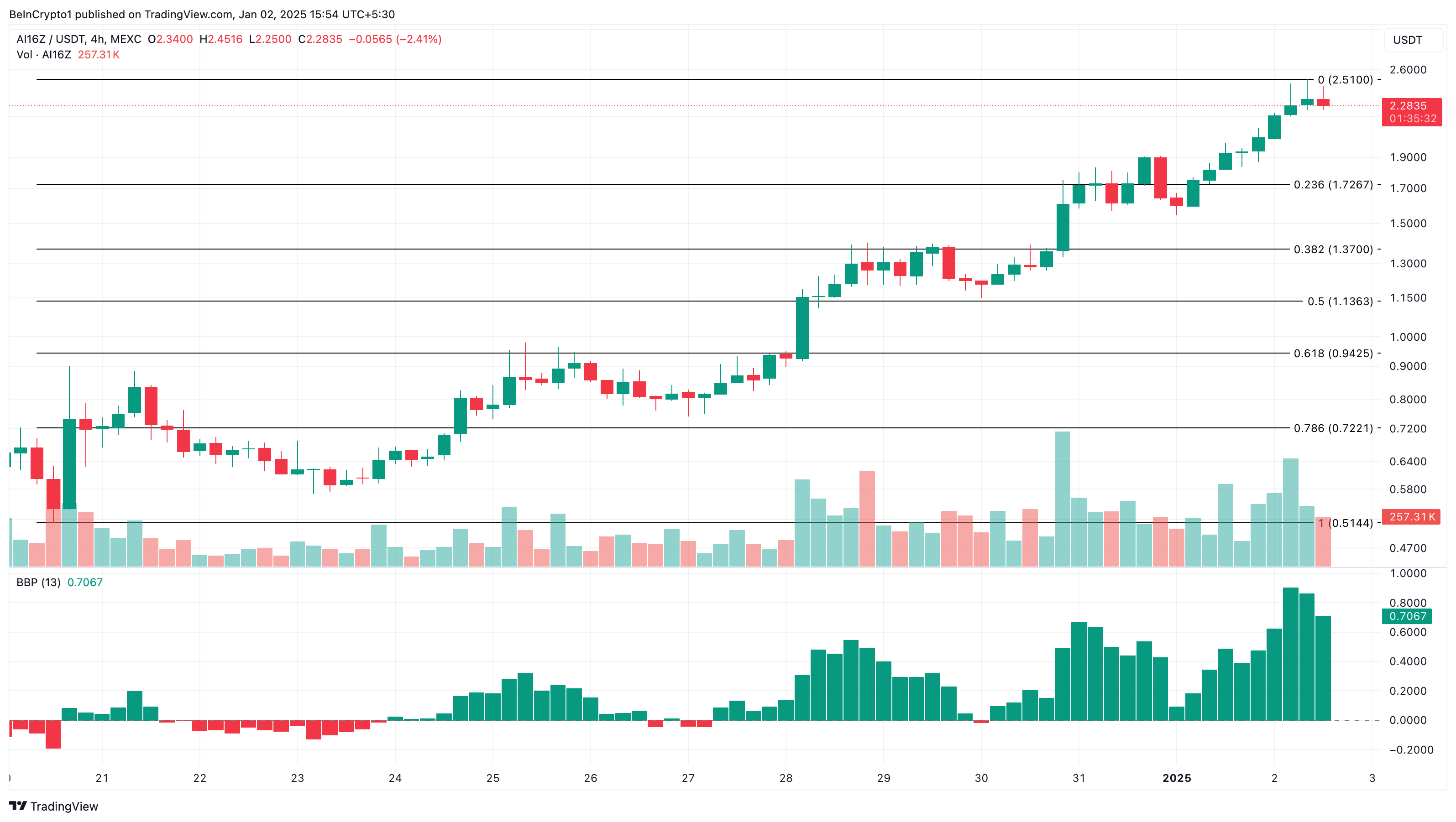 حتى كتابة هذه السطور، يتداول AI16Z عند $2,27. على الرسم البياني لمدة 4 ساعات، ظل مؤشر قوة الثور والدب (BBP) في المنطقة الإيجابية. هذا يشير إلى أن الثيران يسيطرون على اتجاه العملة البديلة.
