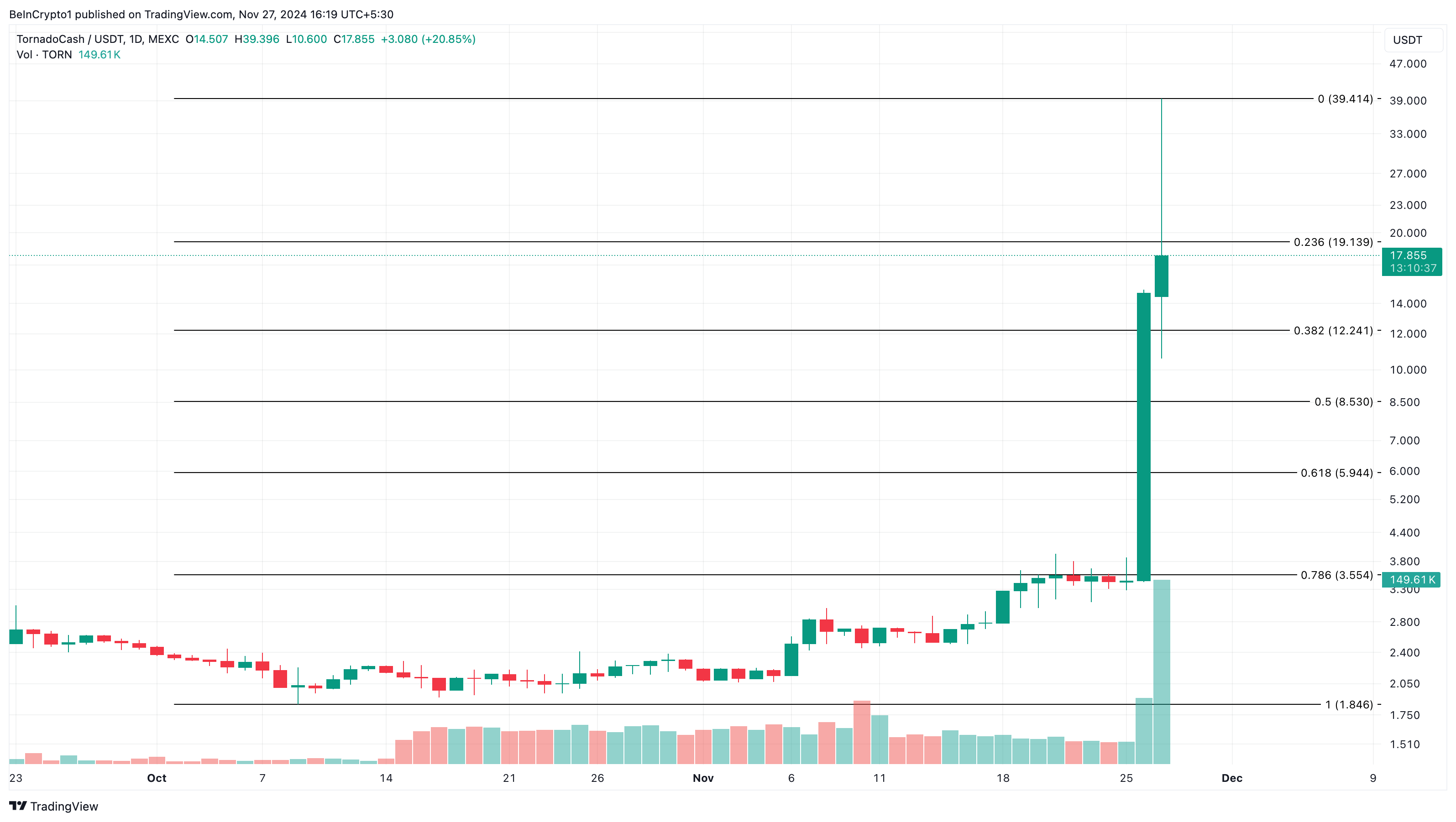 نتيجة لذلك، ارتفع سعر عملة TORN بنسبة 396% خلال الـ24 ساعة الماضية، ليصل إلى 17.86 دولارًا. وبحسب الرسم البياني اليومي، ارتفع حجم التداول بشكل ملحوظ، مما يشير إلى اهتمام واسع بالعملة.