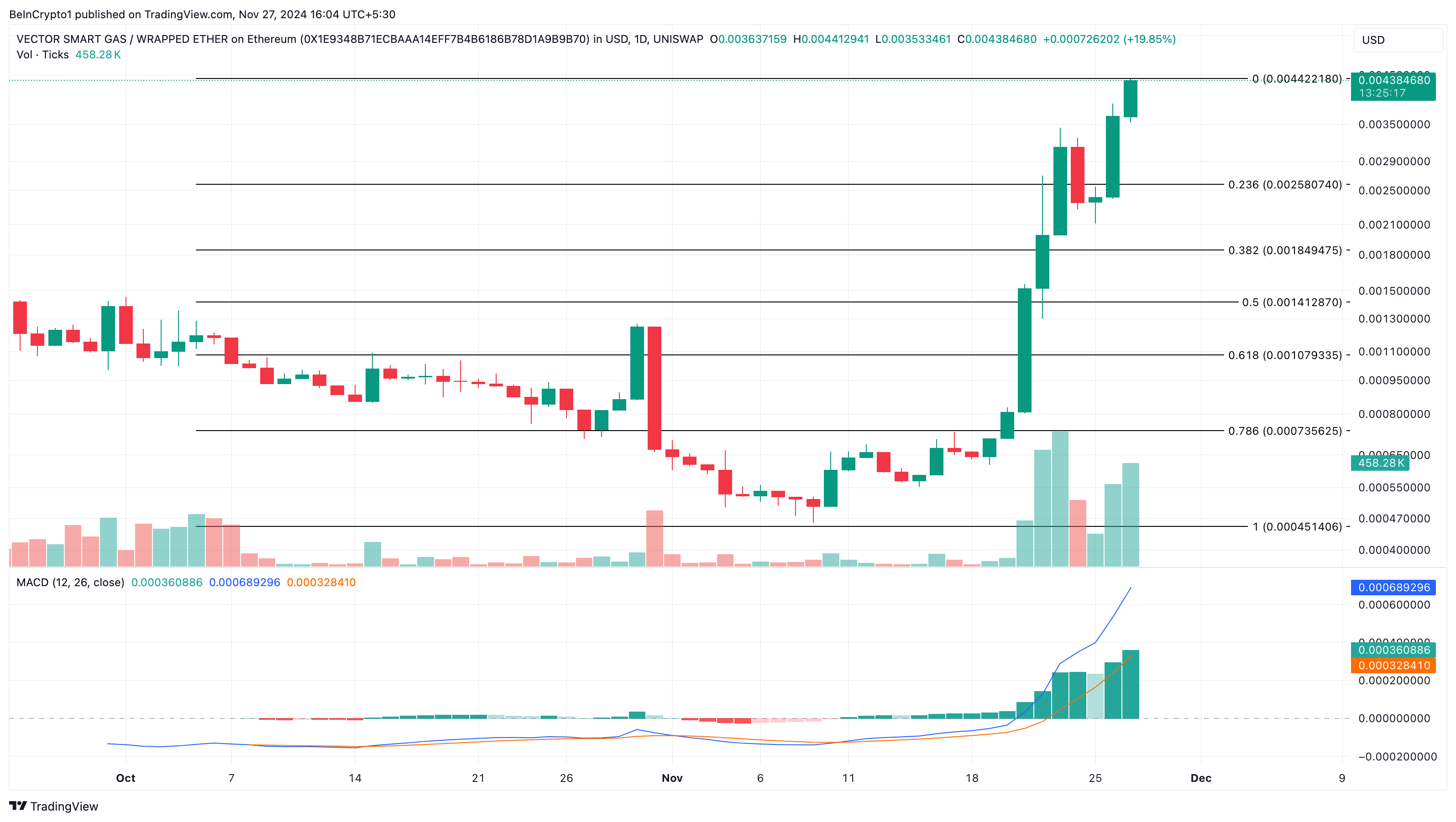 في وقت النشر، سعر VSG هو $0,0044. علاوة على ذلك، يظهر الرسم البياني اليومي أن تقارب وتباعد المتوسط المتحرك (MACD) إيجابي، مما يشير إلى أن الزخم حول العملة البديلة ظل صعوديًا.