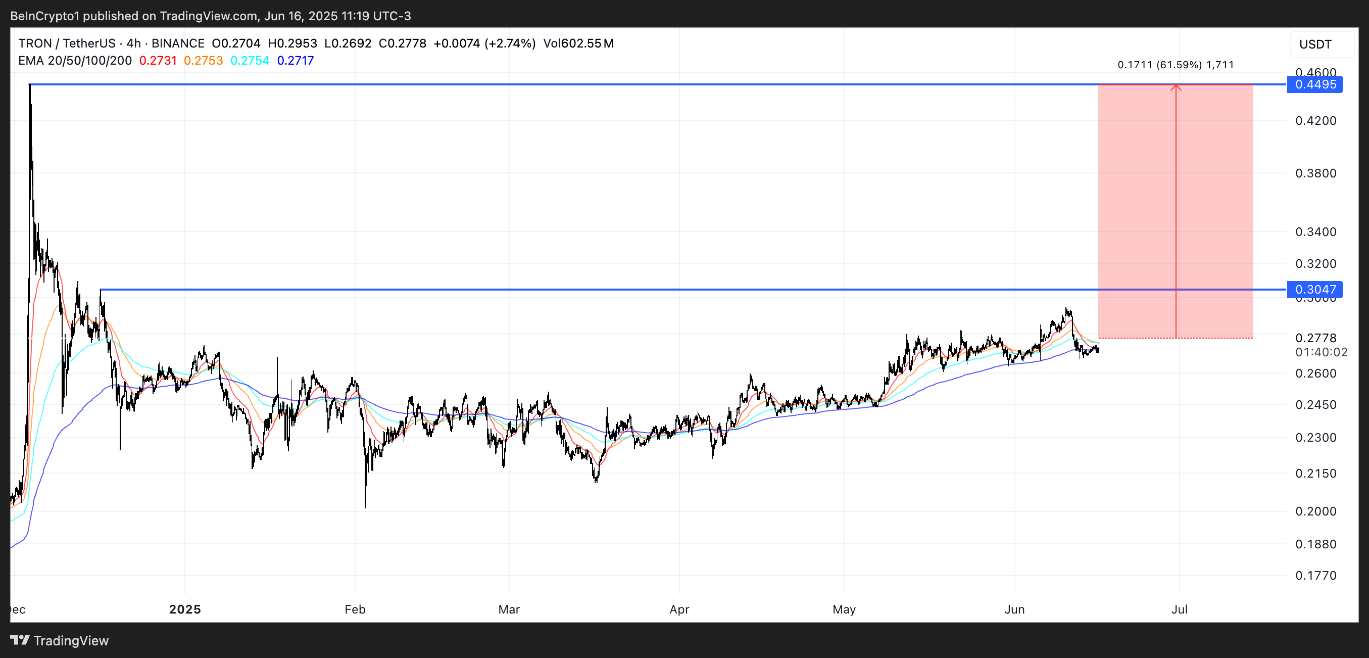 إذا تمكن سعر TRX من كسر المقاومة الرئيسية عند $0,30، فقد يفتح الباب للتحرك نحو $0,45 وربما $0,50 إذا اكتسب الاتجاه الصعودي قوة.